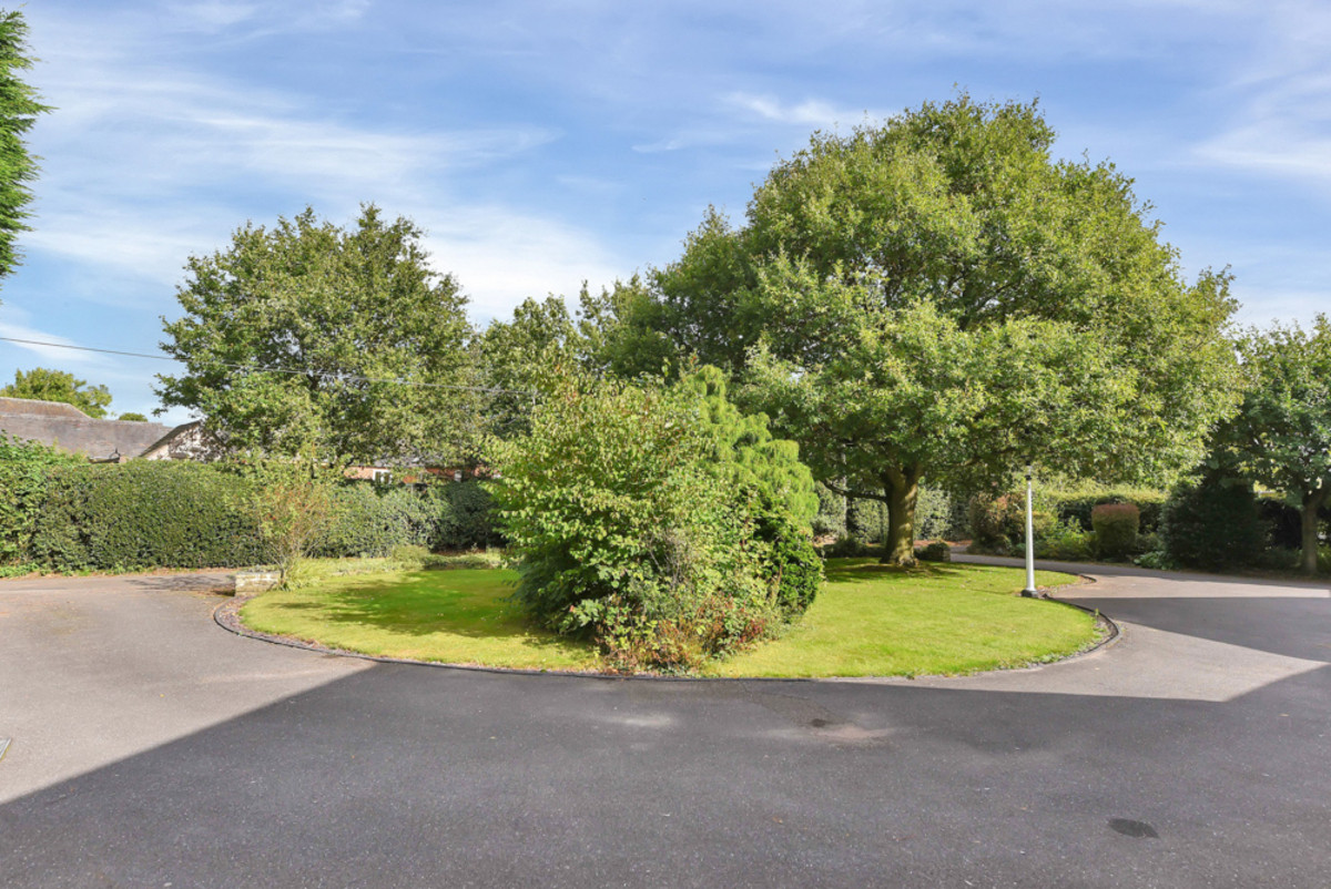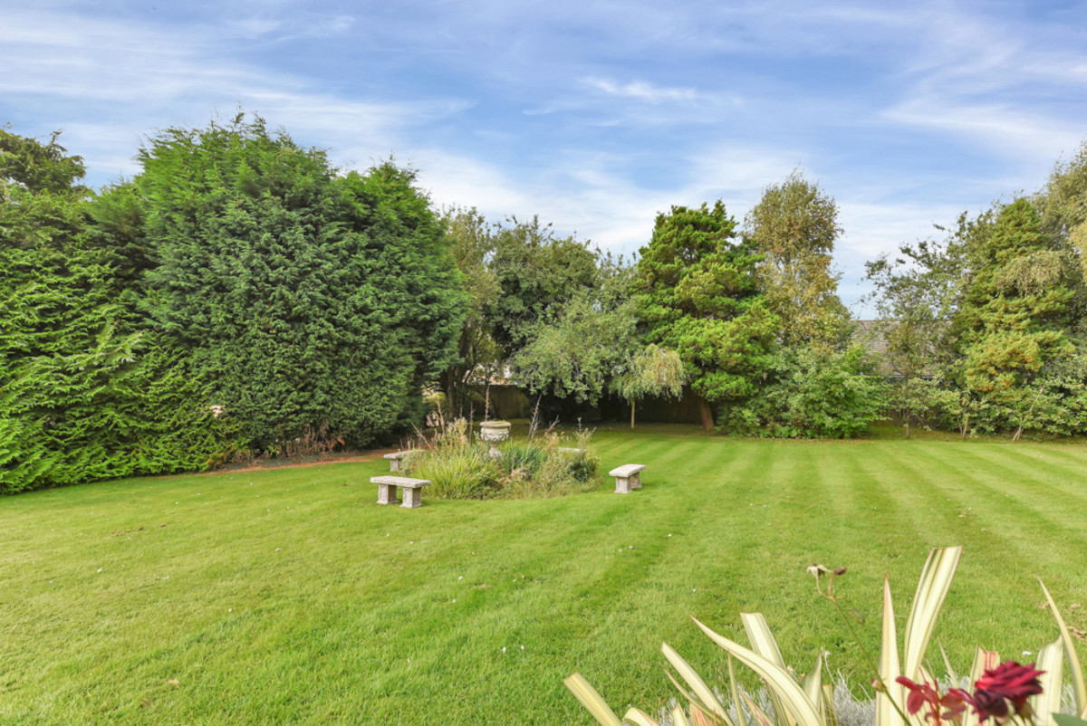 On the west side, wooden gates open to reveal expansive lawned gardens that seamlessly wrap around to the rear, enriched by a diverse collection of mature trees and shrubs. A picturesque circular seating area, complete with an ornamental urn and stone benches, provides a peaceful retreat. The southern boundary, edged by a low hedge, enjoys uninterrupted views over open agricultural fields, enhancing the sense of space and tranquility.