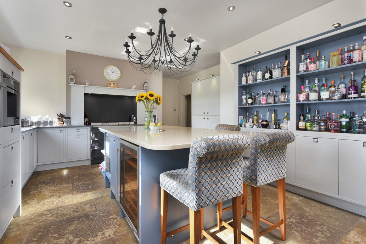 This space also enjoys stunning views to the rear, bringing the beauty of the outdoors inside and creating a bright, airy atmosphere. At the heart of the room, a large central island unit offers not just workspace, but a social hub, complete with a built-in wine cooler, recycling drawer, and a convenient breakfast bar — perfect for informal dining, morning coffee, or evening gatherings. Adding further character are twin dresser units with open display shelving and additional storage below, while natural stone flooring brings warmth and texture to the space. A door leads from the kitchen to a covered area with an outdoor store and WC, also providing direct access to the carport - ideal for practical day-to-day living.