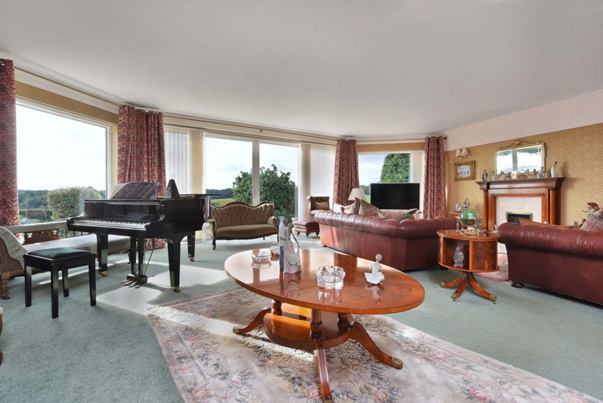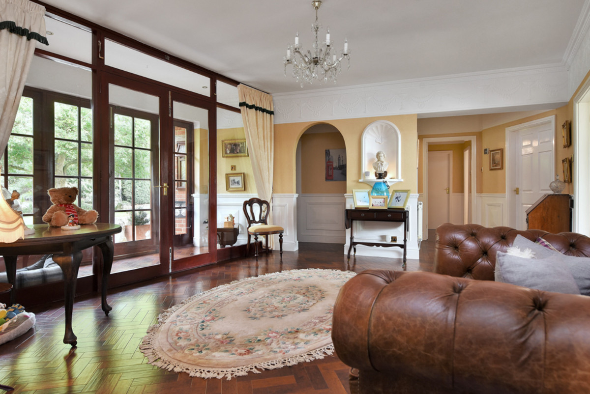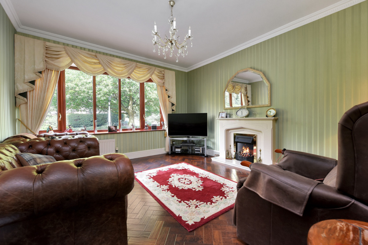 Double doors lead you into the show stopping drawing room - a wonderfully spacious and light-filled centrepiece. Expansive full-height windows and twin sliding doors frame captivating views, seamlessly connecting the room to a generous terrace patio beyond. Here, the outdoors effortlessly becomes part of the living experience, perfect for alfresco dining, entertaining guests, or simply relaxing while soaking up the stunning surroundings. An impressive Adam-style fireplace with a coal-effect gas fire takes centre stage, flanked by built-in display alcoves with glass shelving, while ornate ceiling coving adds an elegant finishing touch.