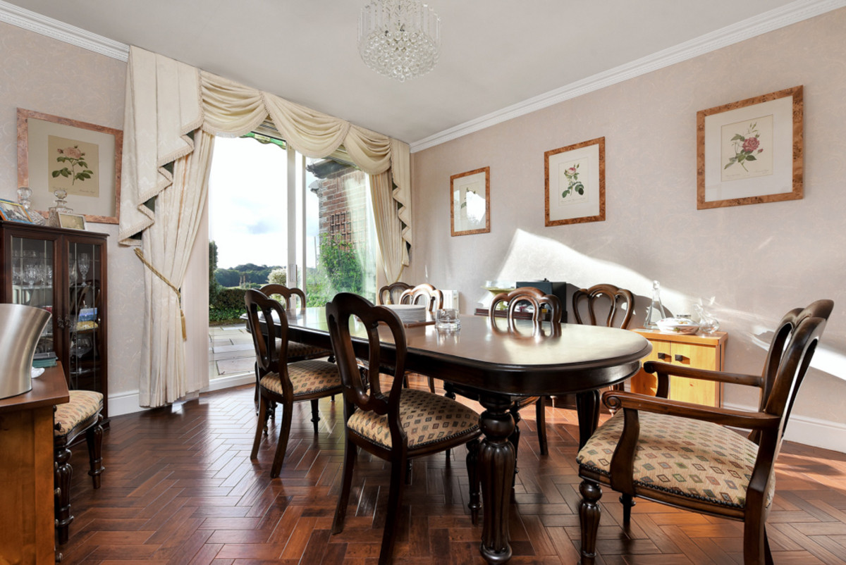 The formal dining room, conveniently accessed from both the reception hallway and the kitchen, also enjoys direct access to the terrace patio through its own patio door - ideal for extending entertaining outdoors and embracing the seamless inside-out lifestyle. Complementing the living spaces is a snug sitting room, providing a more intimate and private setting with a charming outlook over the sweeping double driveway and landscaped frontage — perfect for quiet moments or relaxed evenings.