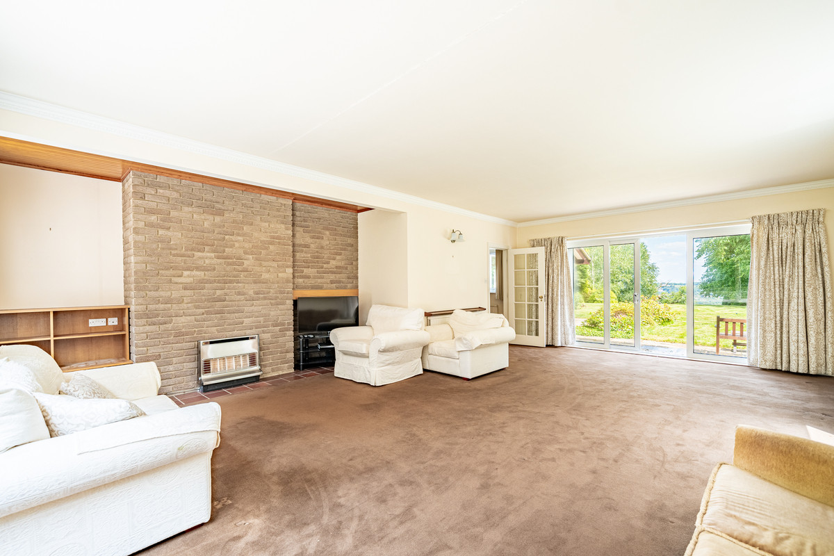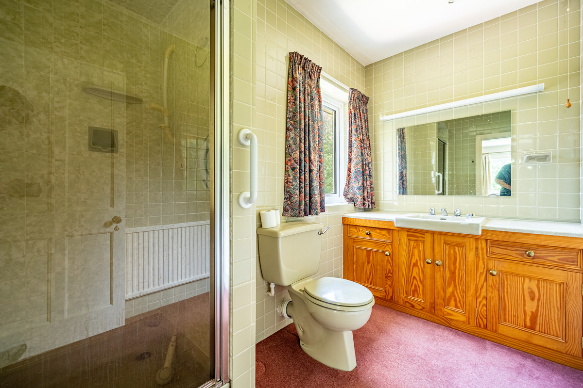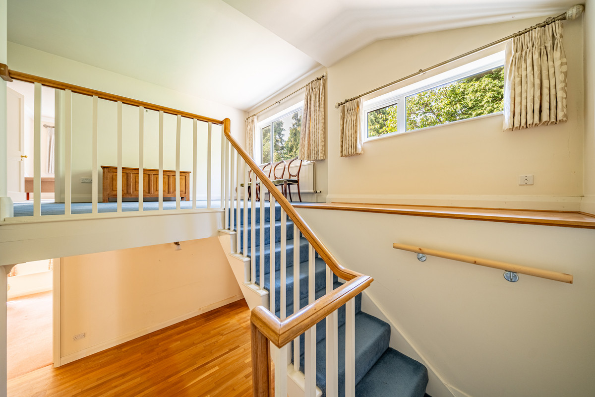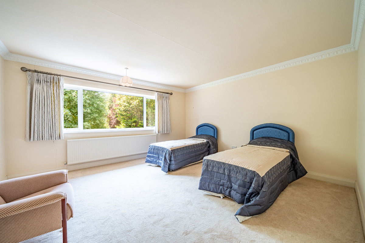 The highlight of the first floor is the principal bedroom, generously proportioned and positioned to take full advantage of the far-reaching panoramic views across the valley. It benefits from its own en suite bathroom and offers an excellent foundation for a striking modernisation. Two further well-sized bedrooms provide flexibility for family life or working from home, all enjoying elevated outlooks and natural light that emphasise the home’s exceptional setting. A family bathroom and a practical storage room, with access to the eaves, complete the upstairs accommodation.