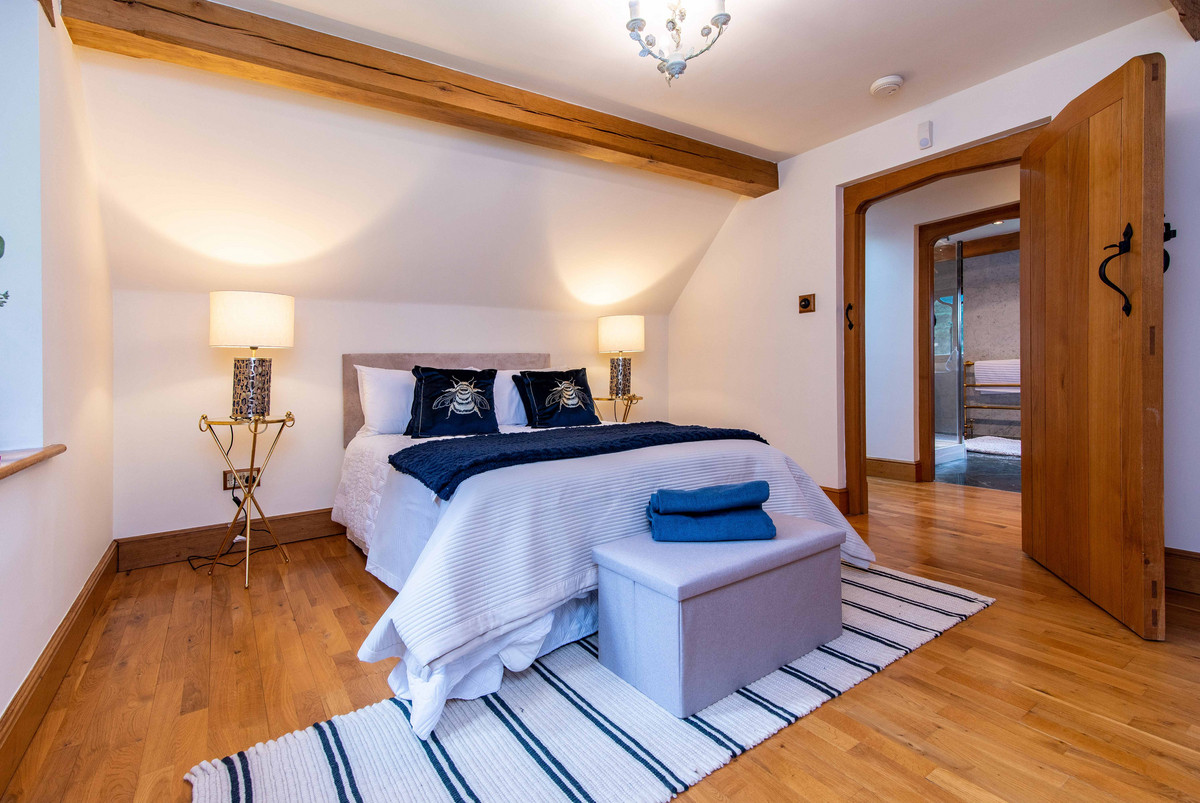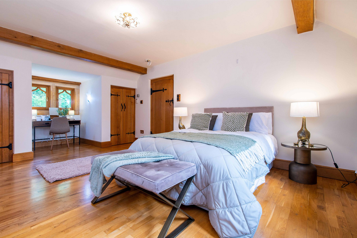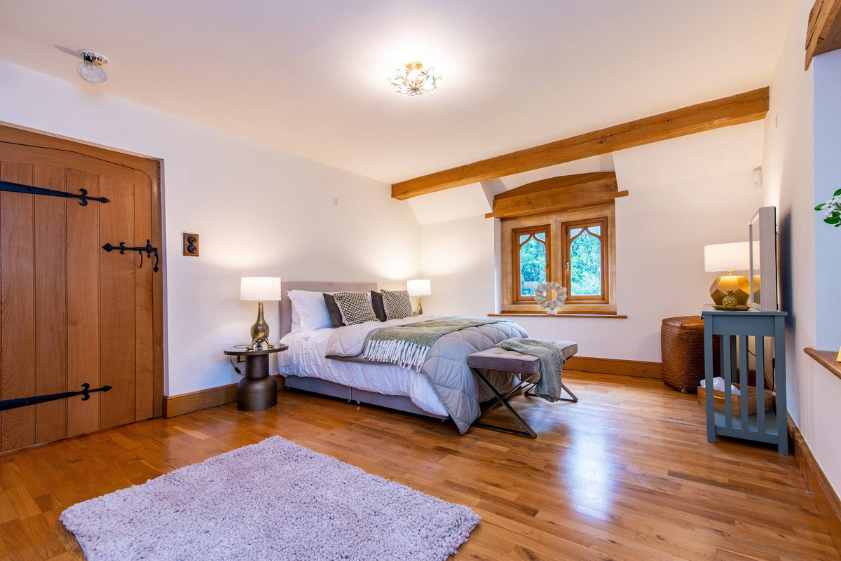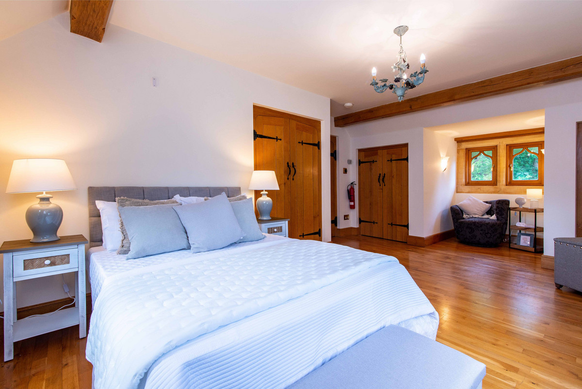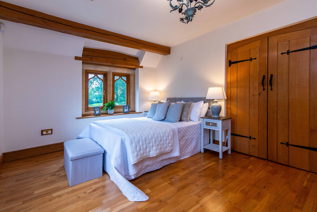 The first floor landing continues to incorporate the features of exposed beams and handmade oak doors which lead to three bedrooms and a large bathroom. The bedrooms are all well-proportioned, two having a range of built-in wardrobes/storage.