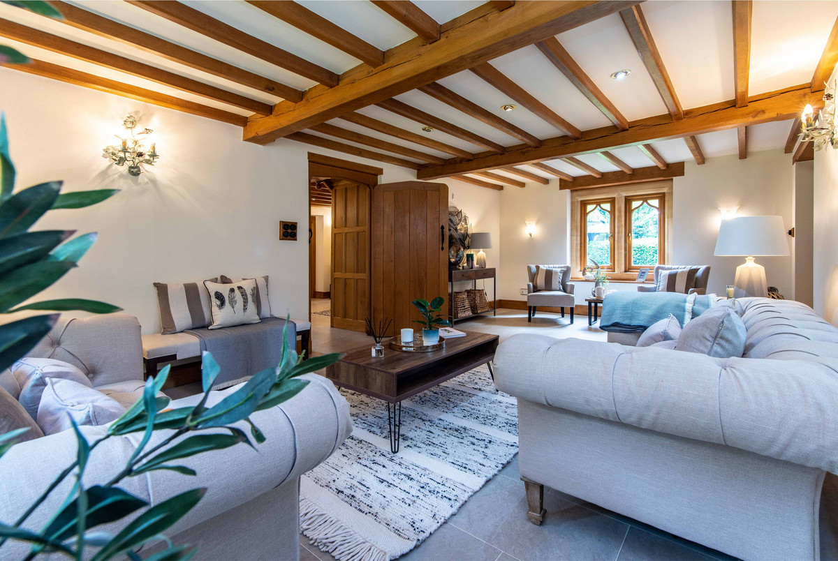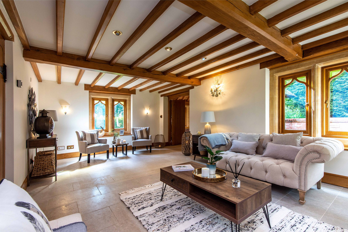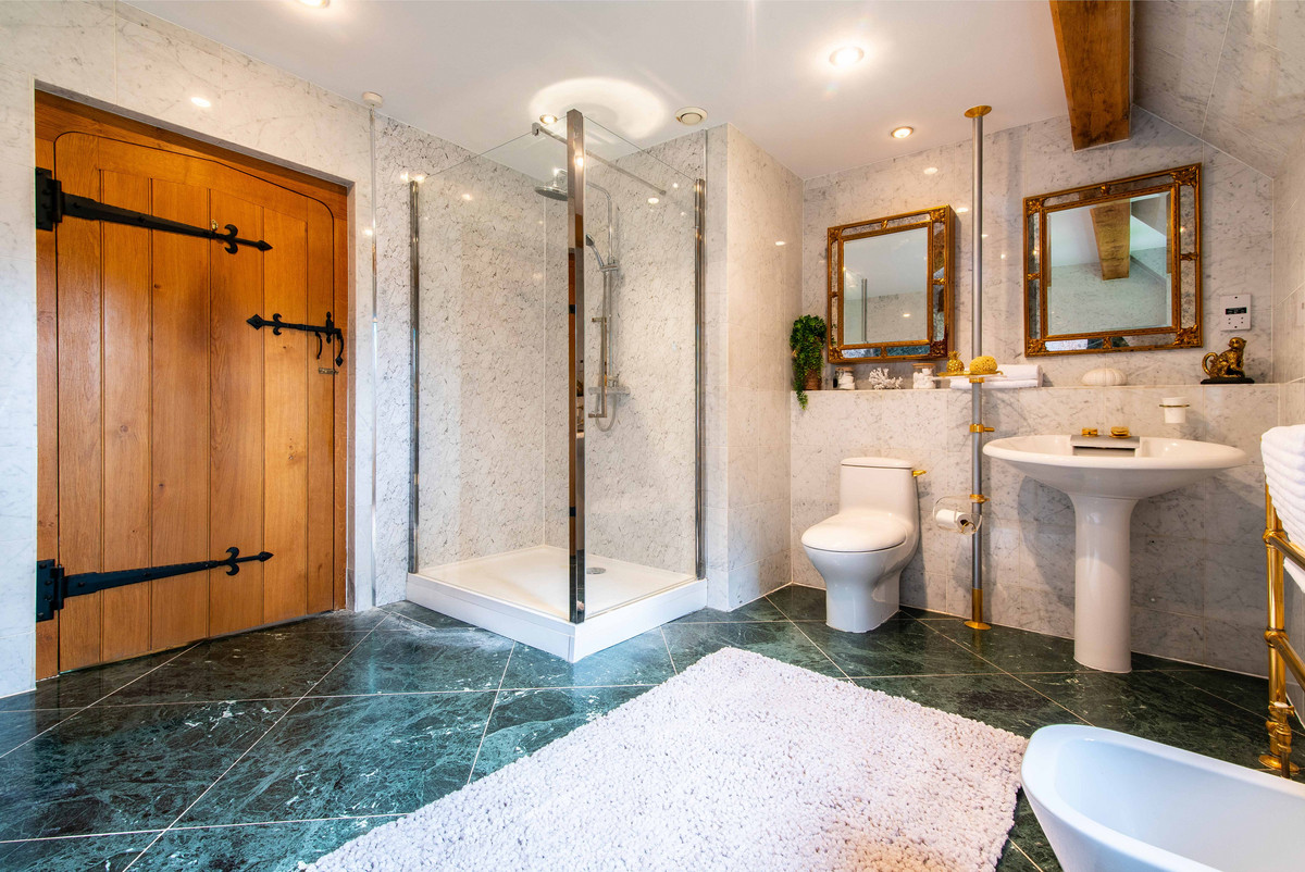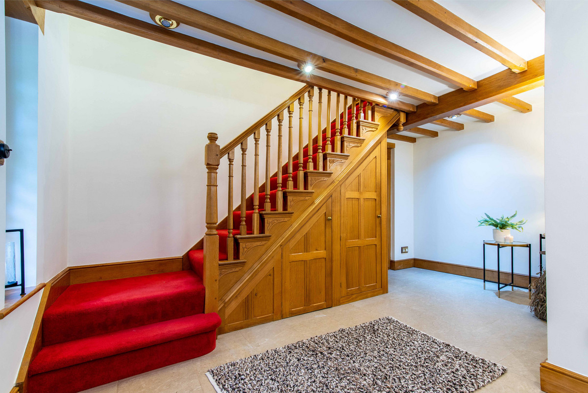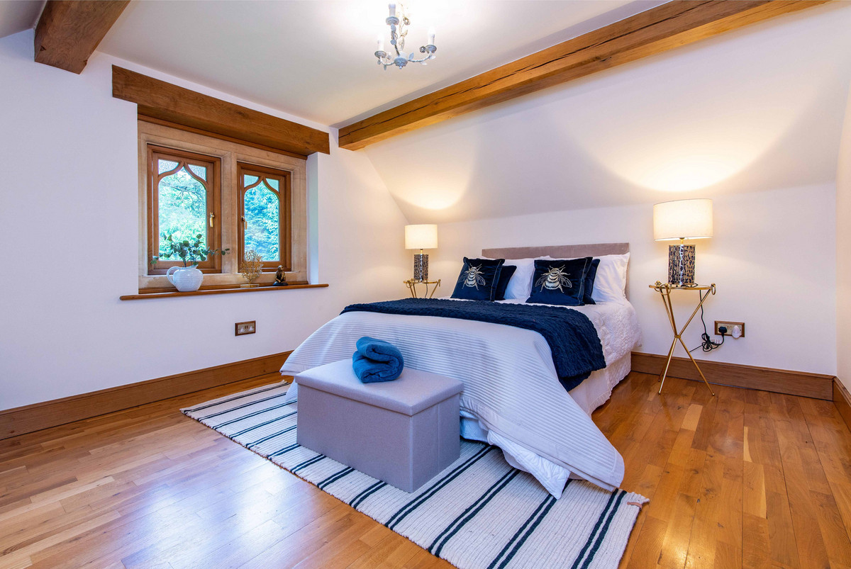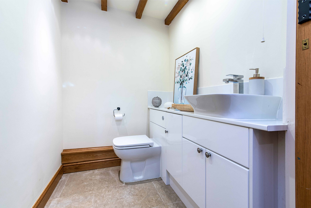 The first floor landing continues to incorporate the features of exposed beams and handmade oak doors which lead to three bedrooms and a large bathroom. The bedrooms are all well-proportioned, two having a range of built-in wardrobes/storage.