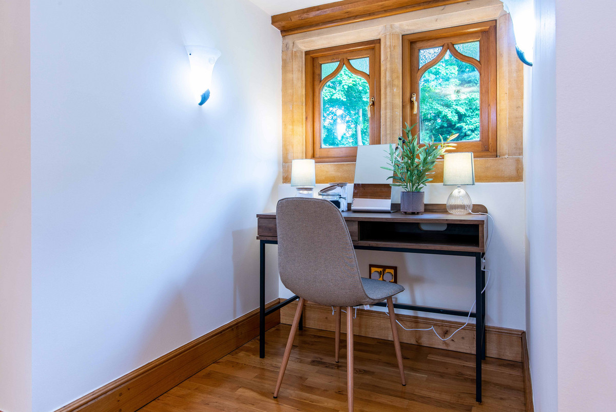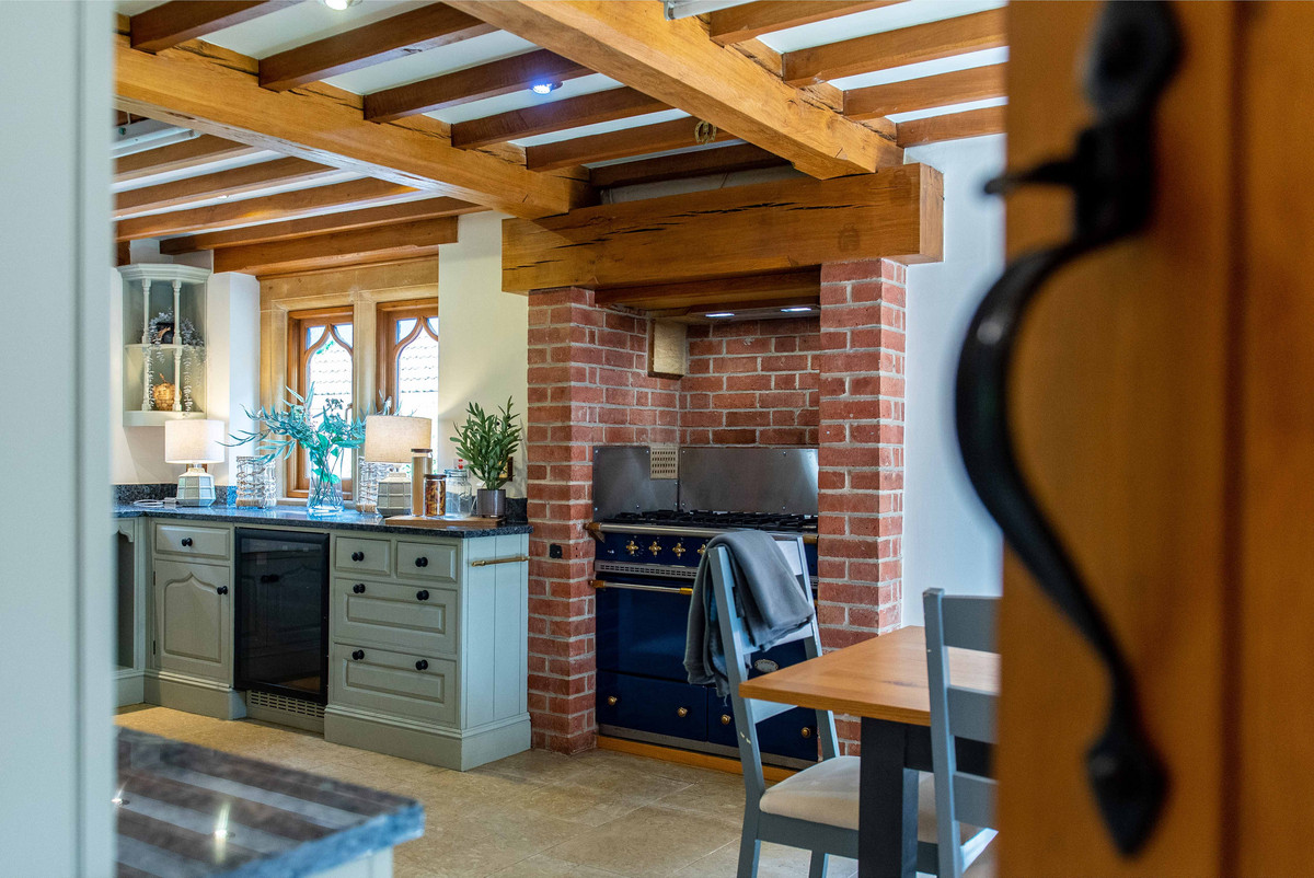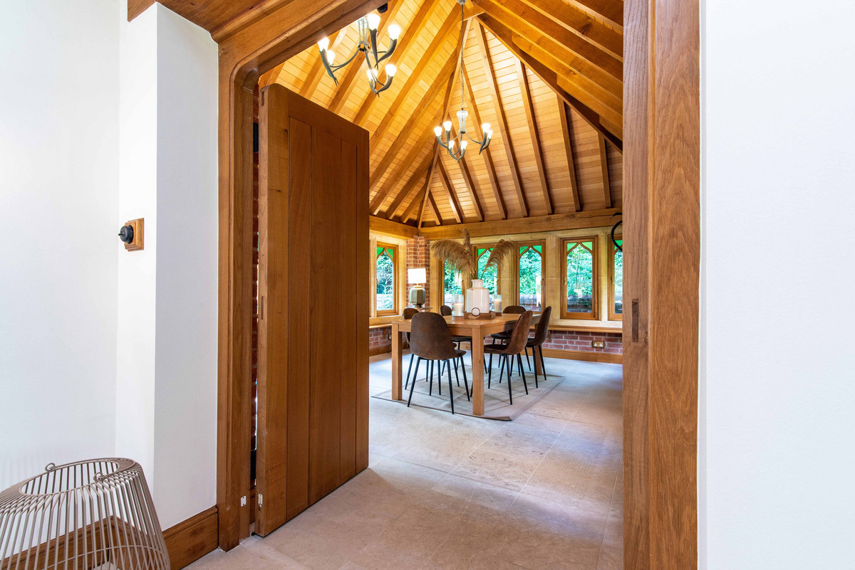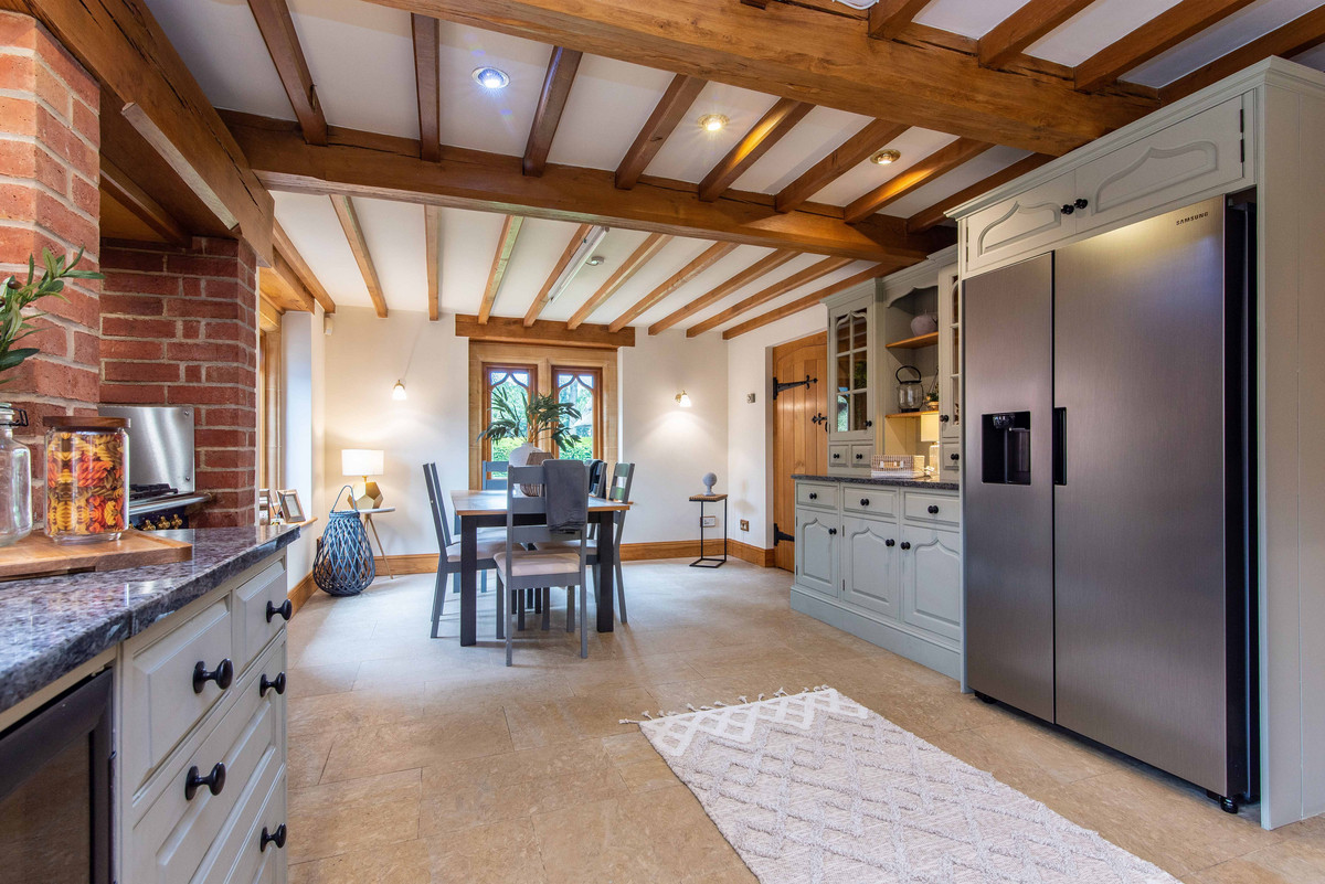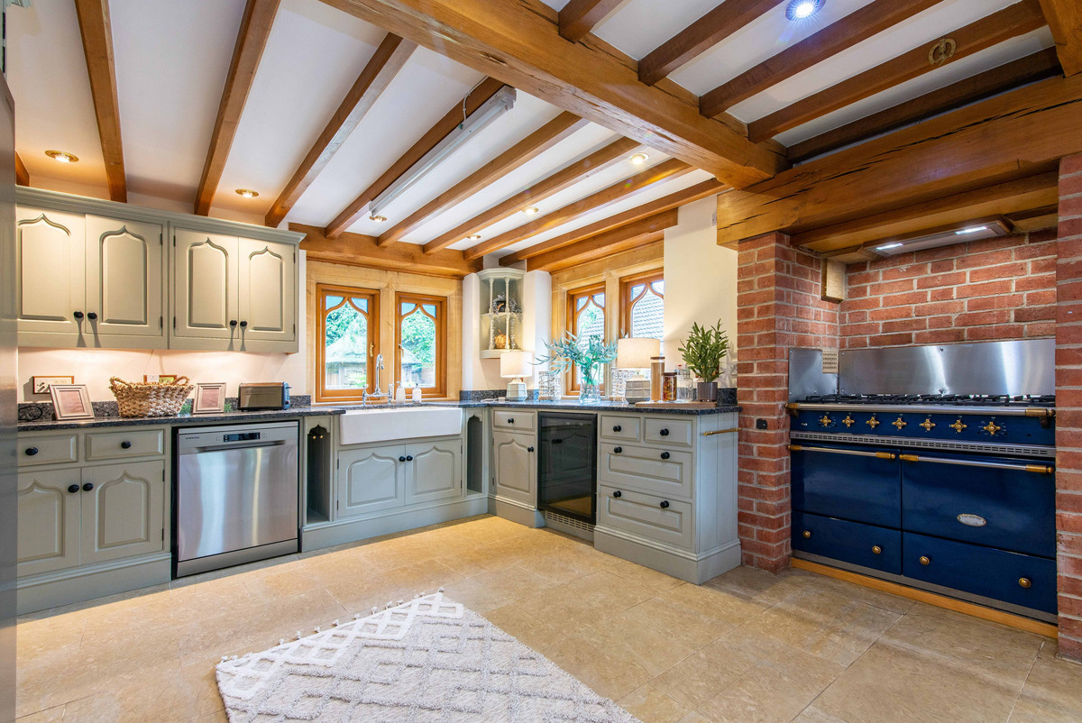 The first floor landing continues to incorporate the features of exposed beams and handmade oak doors which lead to three bedrooms and a large bathroom. The bedrooms are all well-proportioned, two having a range of built-in wardrobes/storage.