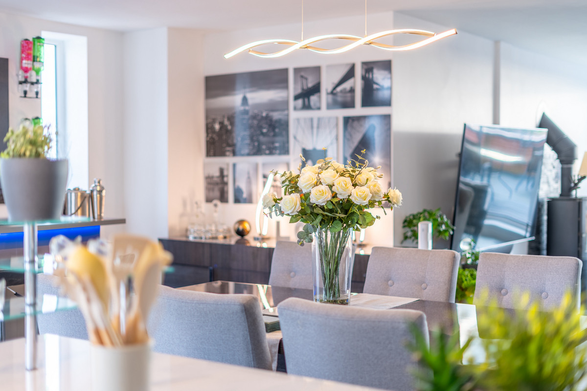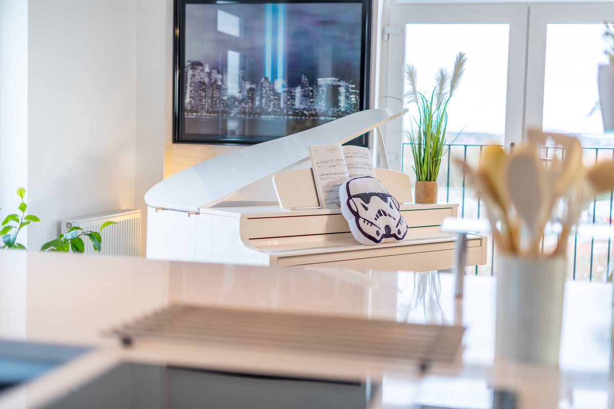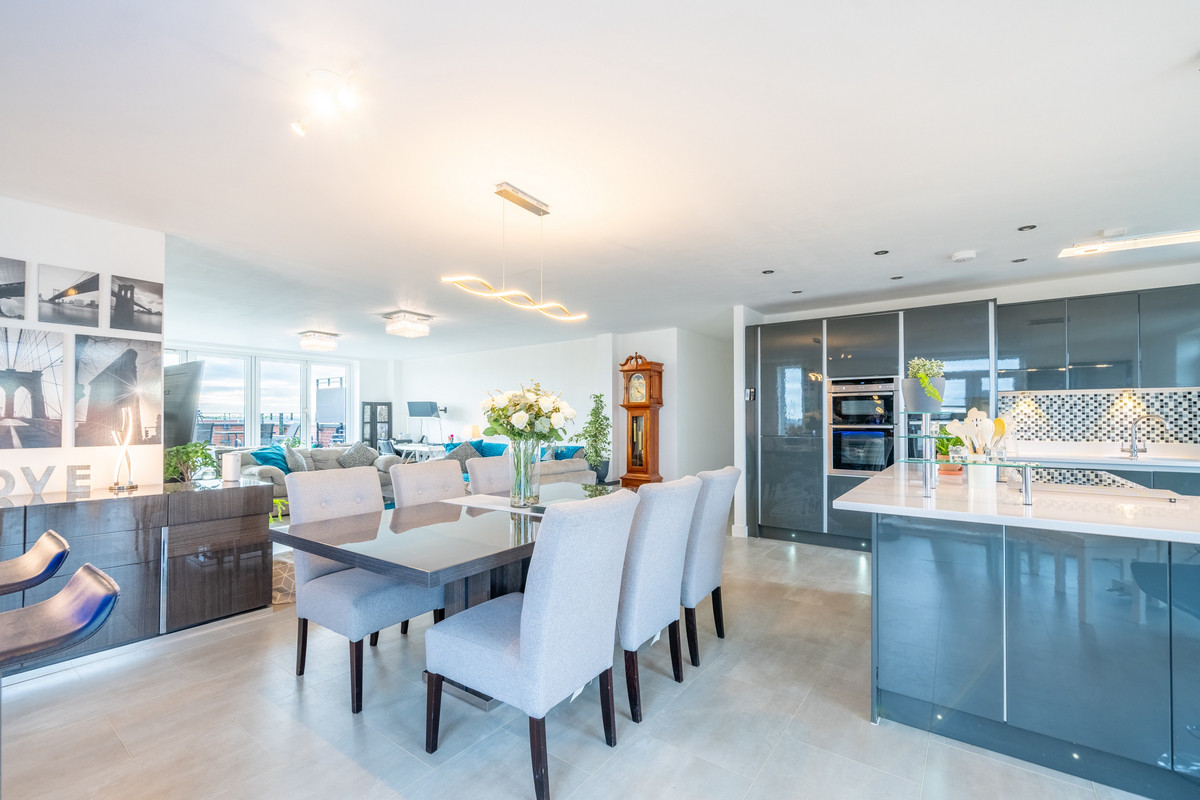 The kitchen, perfectly positioned within the open-plan design, offers stunning views over the city skyline. Its thoughtful layout allows for seamless entertaining, ensuring that whether you are hosting guests or enjoying a quiet meal, the space can be fully utilised. The sleek breakfast bar creates a second dining area, complementing the formal dining space while providing a casual space for everyday living. Adjacent to the kitchen, the entertainment area provides ample space for a bar, piano, or additional relaxation zones.