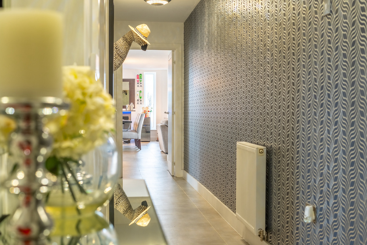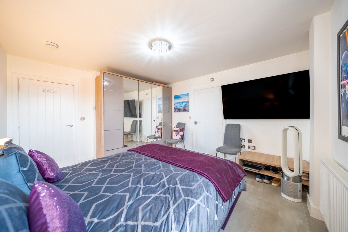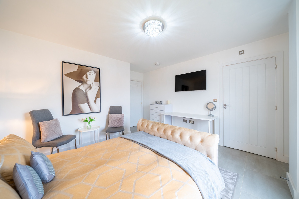 The home features three spacious double bedrooms, two of which benefit from ensuite facilities. Each room offers the flexibility to serve as a tranquil retreat or a stylish home office, catering to modern lifestyle needs. A well-appointed w/c and ample storage space further enhance the convenience of this impressive home. Before entering the main living area, you'll find a large storage cupboard, currently configured as a utility space, housing a washing machine, tumble dryer, and additional appliances.