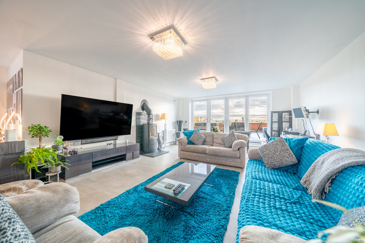 The living room is a true highlight, offering abundant space and the potential for a variety of seating configurations. The standout feature is the log burner, an extraordinary element rarely found in an apartment, creating a cosy, welcoming atmosphere on chilly winter evenings. Expansive bifold doors seamlessly connect the interior to a private terrace, offering a perfect blend of indoor and outdoor living. When fully opened, they extend the apartment's living space, creating a sense of openness and freedom. From the terrace you are offered unparalleled views of the city below along with the countryside beyond, making it an ideal spot for relaxation or entertaining.