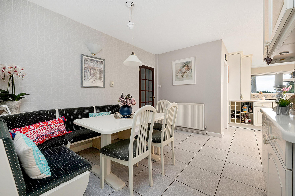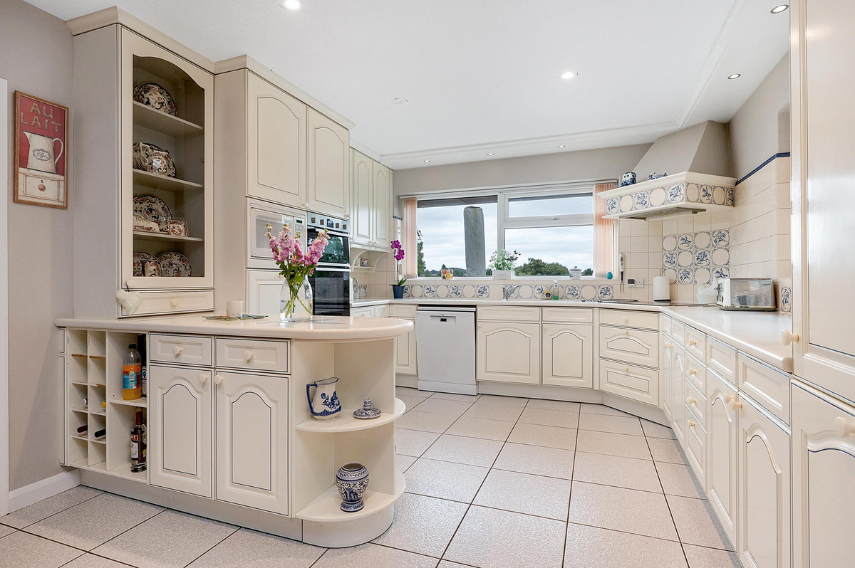 The kitchen itself is well-equipped with fitted cabinetry, integrated appliances, and tiled flooring throughout. Rear-facing windows frame spectacular views, while a separate formal dining room, perfectly suited for hosting, is accessed from the kitchen. A practical utility room ensures convenience for modern family life.