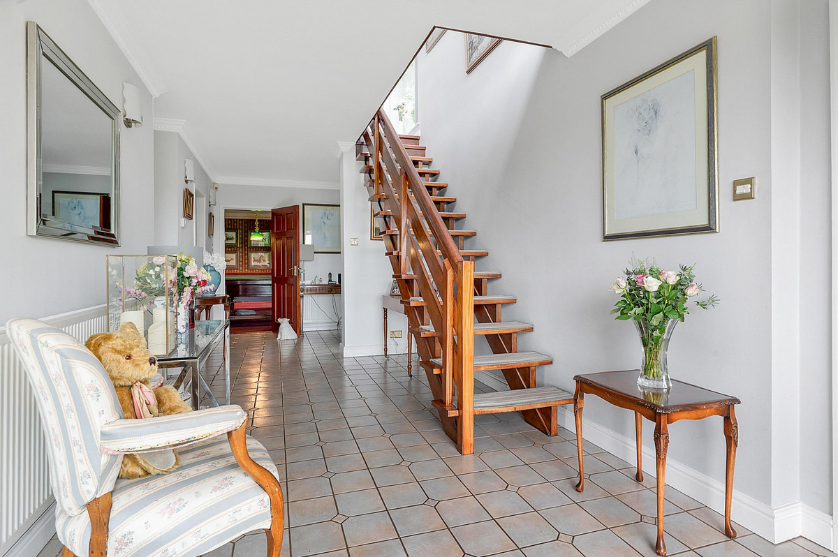 Upon entering the home, you are welcomed by a spacious and luminous reception hallway where tiled flooring extends beneathfoot and large picture windows flood the space with natural light. The glazed door opens to the garden and patio beyond, offering captivating views that immediately establish a sense of calm and connection with the stunning natural surroundings. This central hub effortlessly links to a guest cloakroom and the principal reception rooms, each thoughtfully designed to provide a perfect balance between formal elegance and comfortable everyday living. A sweeping staircase rises gracefully to the first floor, anchoring this inviting entrance.