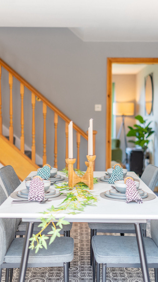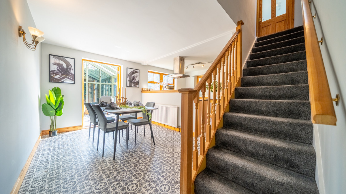 Ground Floor – Upon entering the home, you are greeted by an inviting entrance hall. The ground floor comprises a spacious living room with bifold doors opening onto the front garden The adjacent kitchen/diner is designed for everyday meals and entertaining, featuring wooden cabinets, granite countertops, and a stainless steel range hood above a black range cooker. The kitchen/diner flows into a bright conservatory with green-framed windows, offering views of the surrounding garden. A utility room provides additional space for laundry and storage, while the integral garage adds convenience and security. A Great family addition is the downstairs WC.