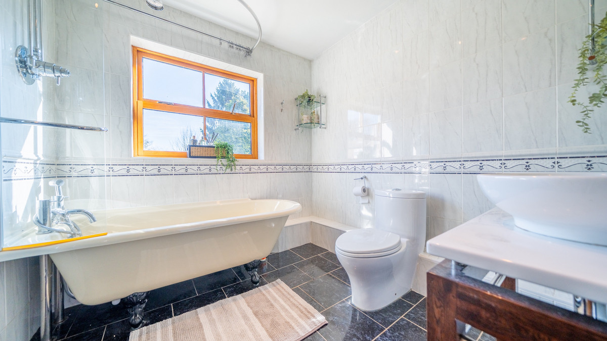 First Floor - The first floor hosts four well-proportioned bedrooms. The master bedroom includes a private balcony with serene views and an en-suite bathroom with tiled walls and a glass-enclosed shower. Bedrooms two and three are spacious and versatile, while bedroom four is perfect for a child's room or home office. The family bathroom features a freestanding bathtub with claw feet and a shower head. Ample storage is provided over this floor.