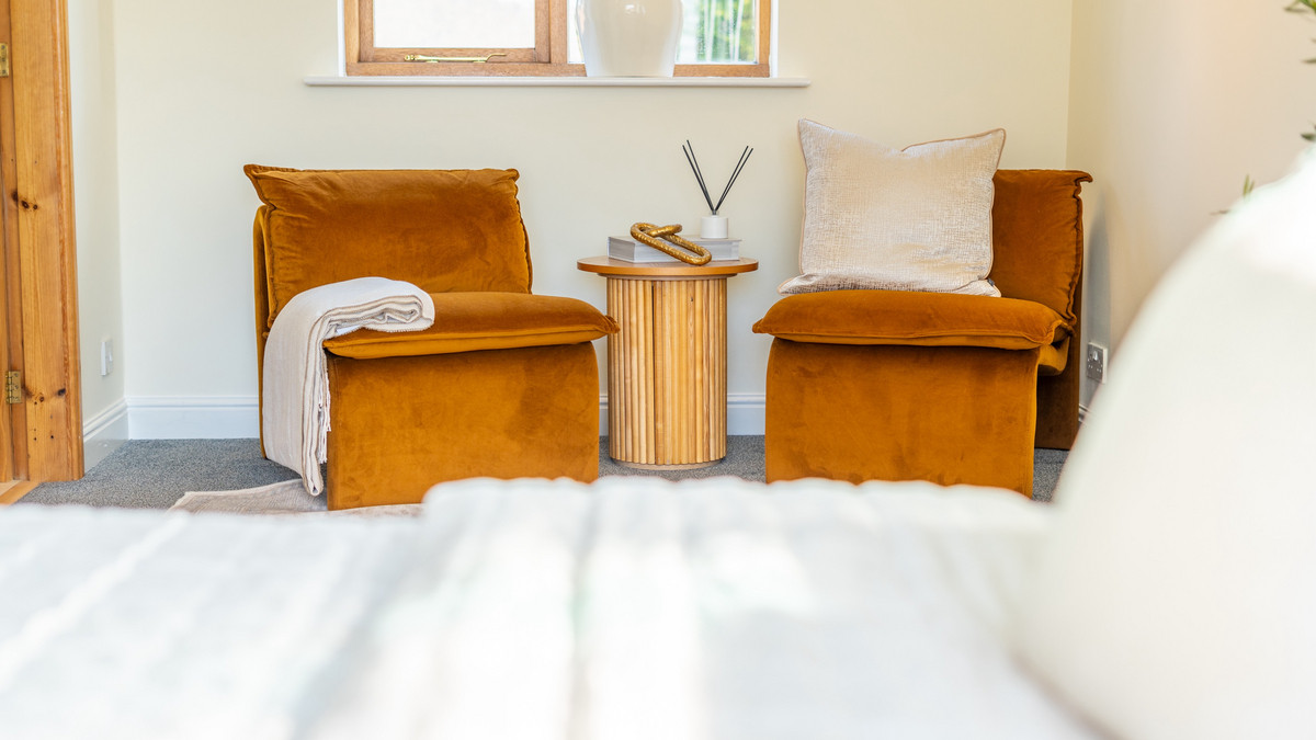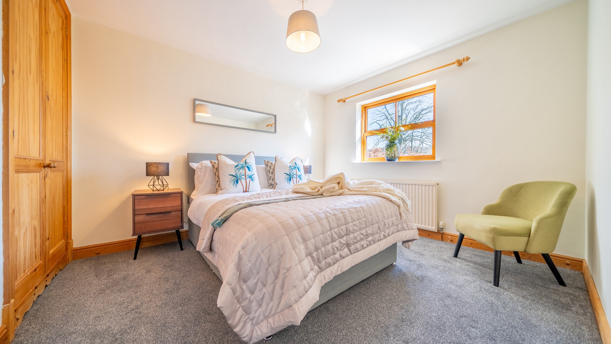 Outside - The exterior of Beech Hedges boasts beautifully presented gardens with a private and tranquil outdoor space. A well-maintained lawn is bordered by mature trees and neatly trimmed hedges. A charming pergola with climbing plants offers a shaded area with stone benches and a table, suitable for outdoor relaxation and entertaining. The landscaping includes gravelled areas and established plants, creating a picturesque setting.