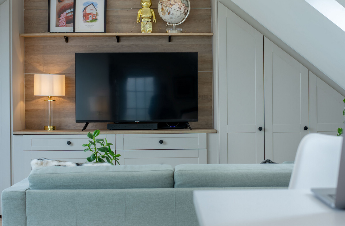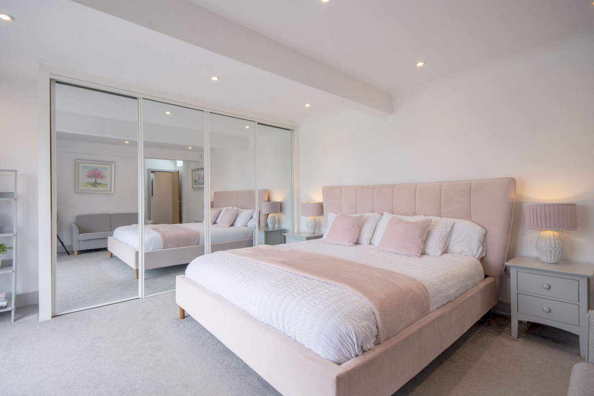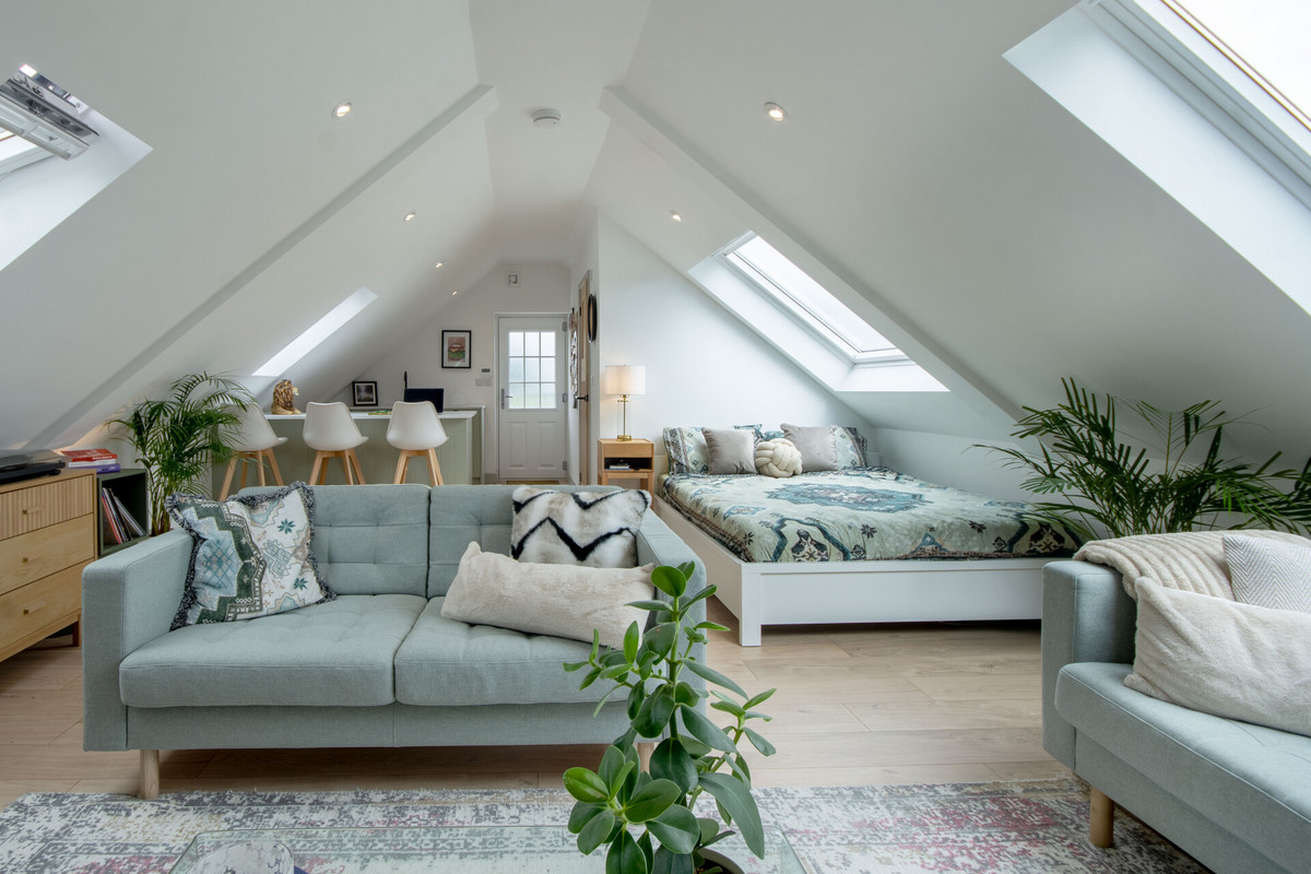 A metal staircase takes you up to Little Acorns living space, an incredible size with self contained kitchen and separate shower room with zoned spaces for a King-sized bed as too a sitting area. A fully fitted out with wall with media unit, sound system and wardrobes. Little Acorns is a truly beautifully finished self-contained annex, offering flexibility as guest quarters, studio, or rental yield in an area of outstanding natural beauty and a great tourist spot.