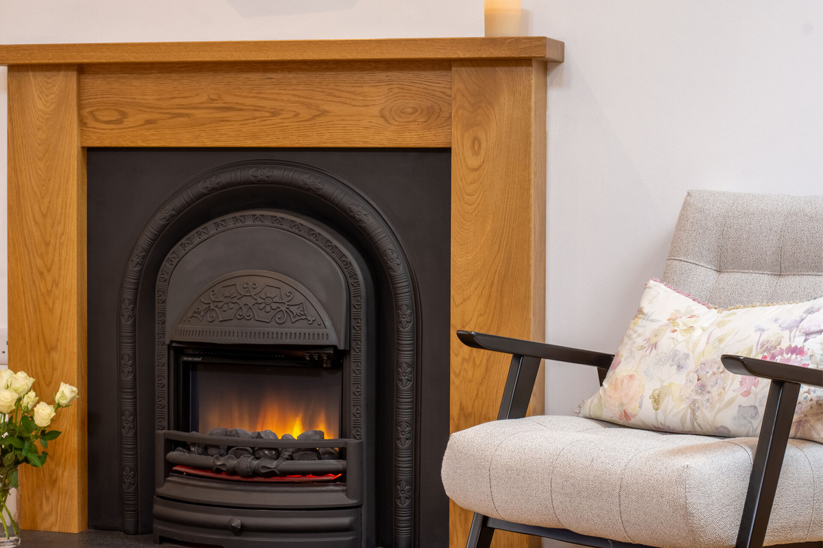 The beautiful engineered oak flooring feels cosy and warm as you walk through to the open-plan living space defined by vaulted A-frame ceilings and exposed timber beams. Dual-aspect bi-fold doors flood the area with natural light and extend living to the garden terrace. A stylish electric fireplace with oak-style surround anchors this elegant sitting and family room whilst just off is a discrete laundry and cloaks room.
