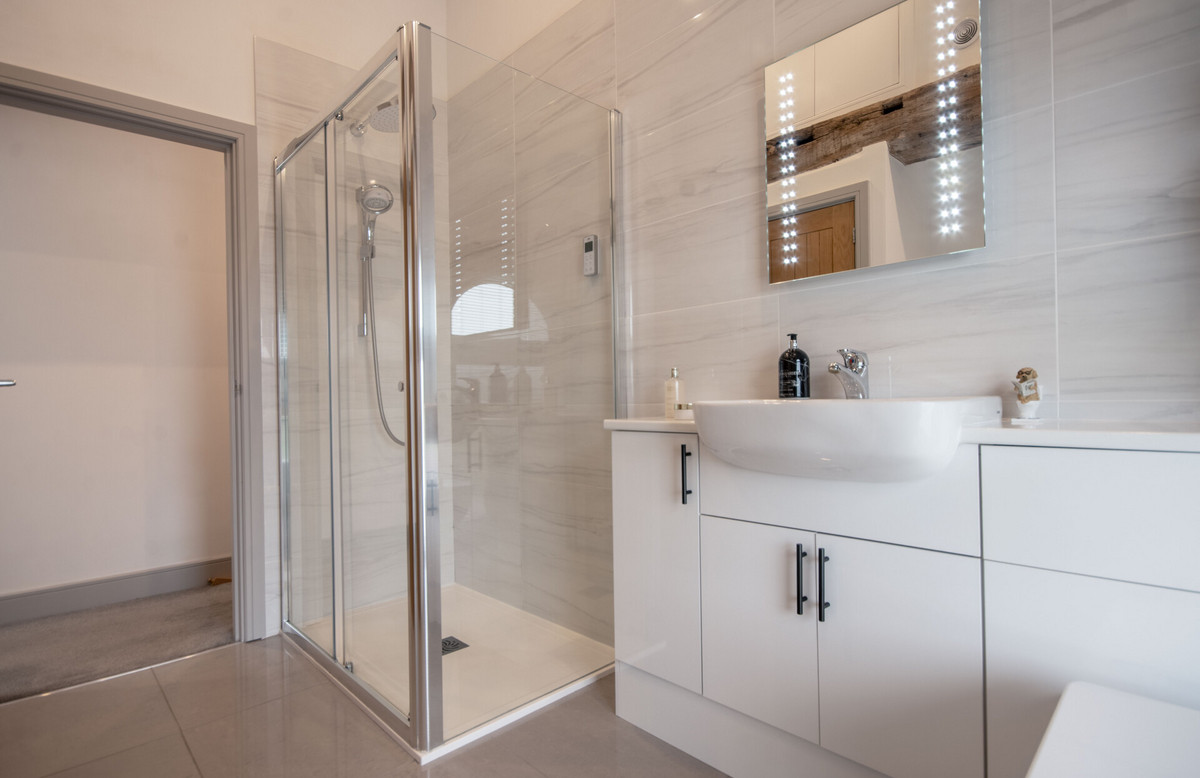 This is a stunning addition, newly built by the current owners and provides garaging and storage for 3 cars. To the side next to the lawned garden is a patio area for BBQ’s and a side door to the ground floor of Little Acorns providing a doggy shower perfect for those muddy paw and welly boot country walk moments and a stunning separate cloaks-room. As with anything the current owners have considered the design both externally and internally, the use of luxury fittings is clear to see and Little Acorns even has an internal beautifully tiled doggy shower on the ground floor.