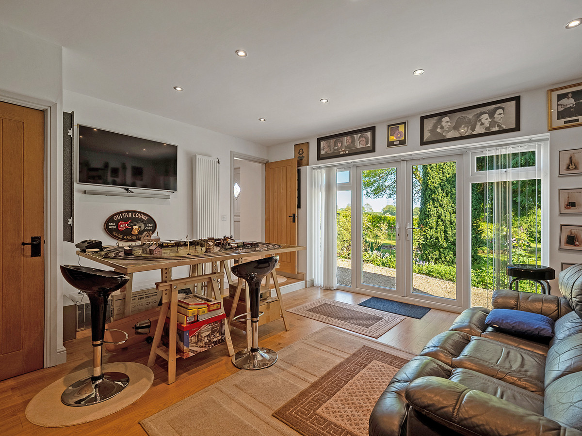 The newly rebuilt annexe accessed via a UPVC stable door comprises of an entrance hallway, sitting room (currently used as a music room) with patio doors leading out into the garden, a large home office/sitting room and a WC. To the first floor are two double bedrooms and a shower room with w/c, wash hand basin and a heated towel radiator. Located behind the annexe is a double garage with electric up and over door.