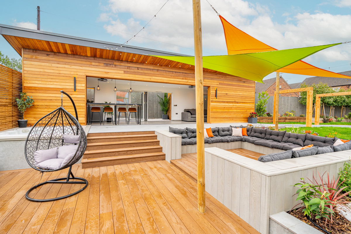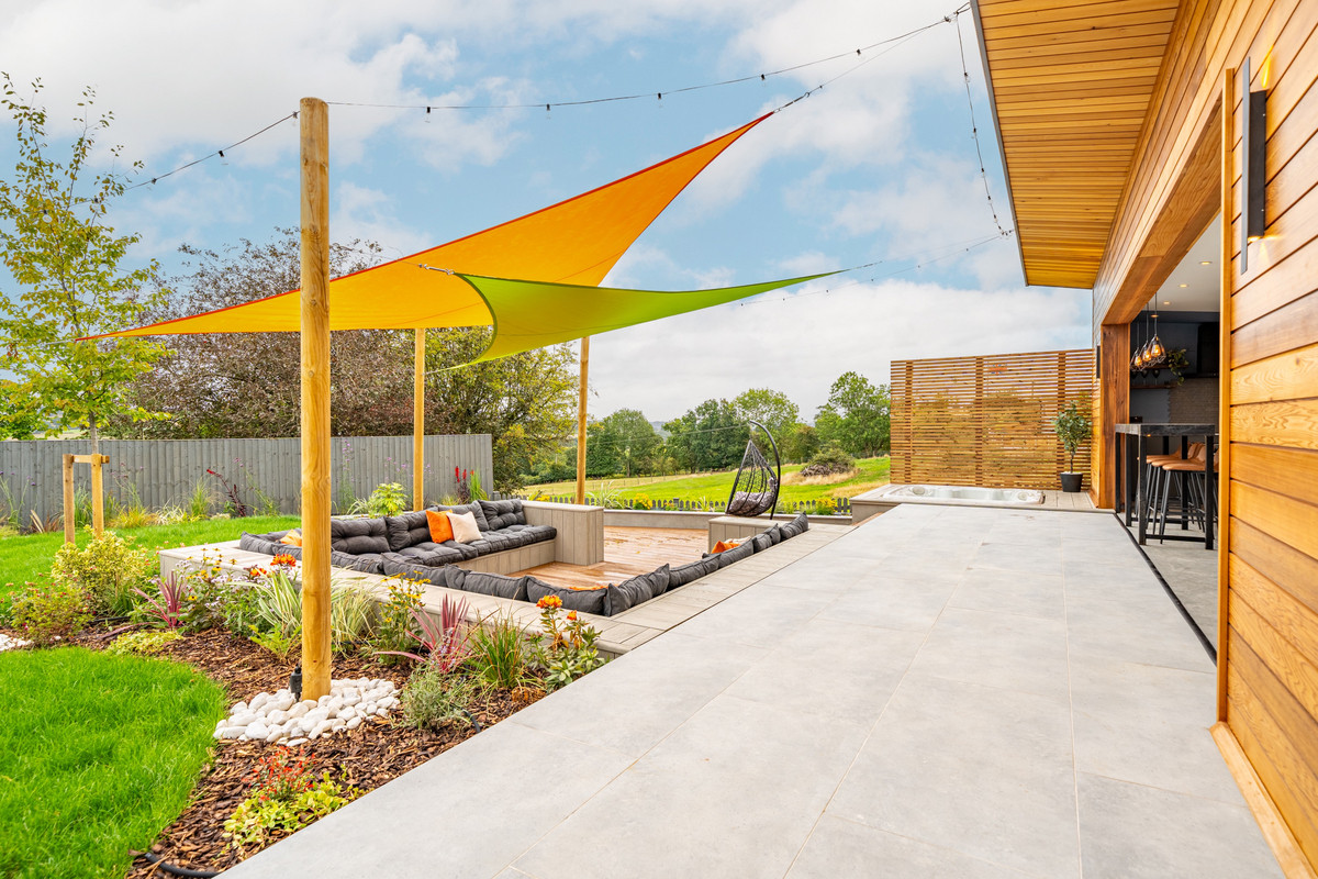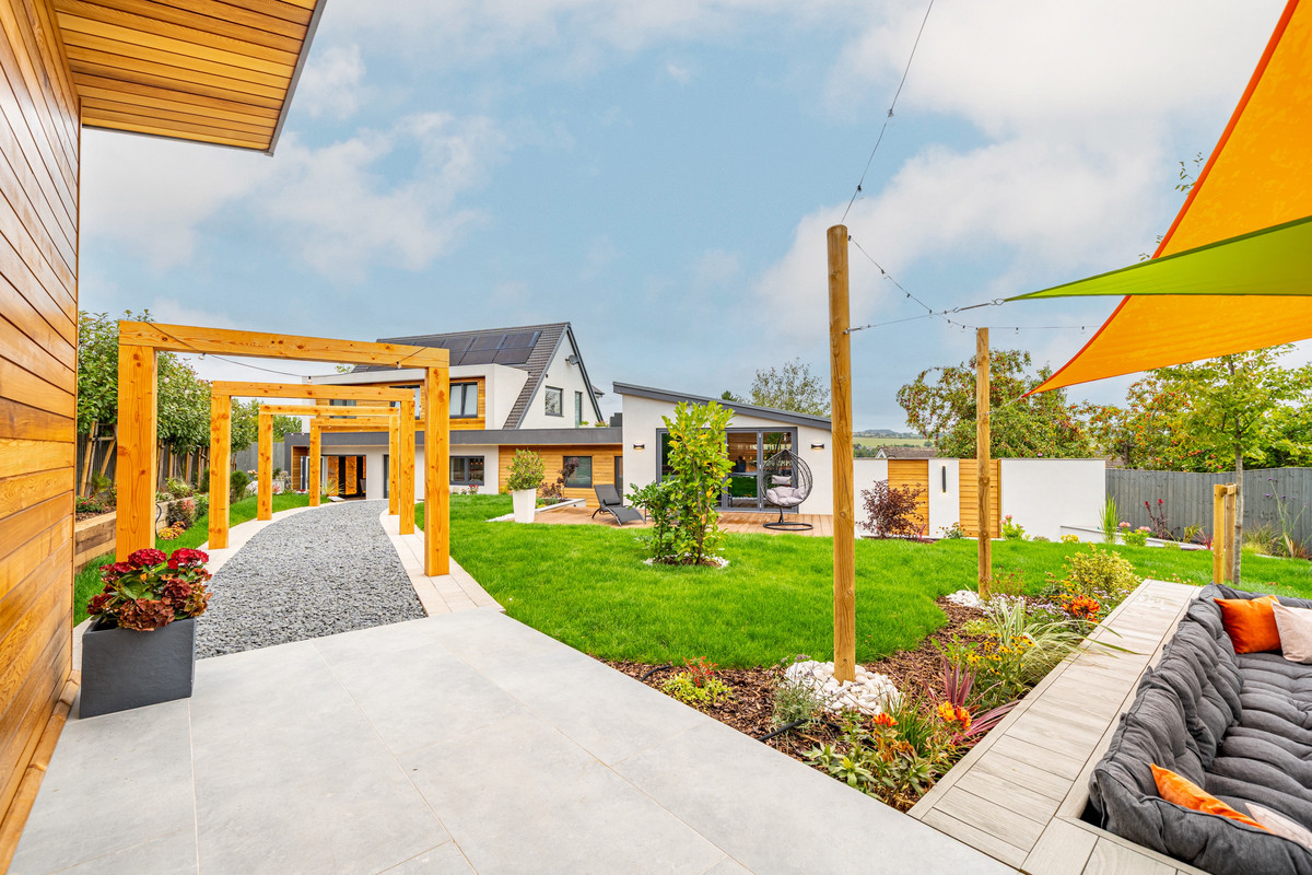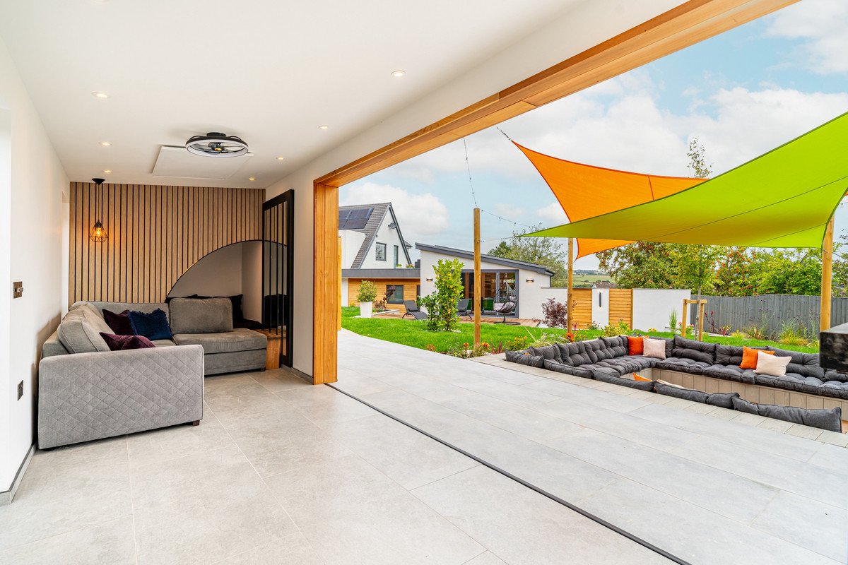 Outside the property has a lovely private garden with various large entertaining areas that are ideal for al fresco dining and entertaining friends and family. The garden also boasts a stunning garden room with its very own fully fitted kitchen and bar area that is ideal for entertaining whatever the weather. The garden room also has a snug area, and bi fold doors leading out to an intimate dining and bbq area. To the front of the garden room is a sunken hot tub with far reaching countryside views, and a sunken seating area with sail shades that is perfect for unwinding on those lazy sunny days. The garden also has an automated smart irrigation system ensuring that the garden and raised beds will look after themselves.