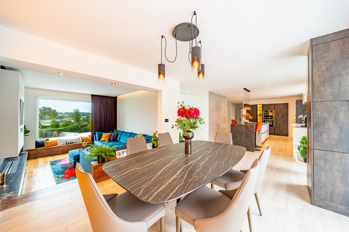 The kitchen flows into the dining area with bi-fold doors leading out onto the patio area. The real feature of the dining area is the Venetian plaster feature wall with fitted orange onyx panels with LED backlighting providing a warm and ambient space to entertain friends and family. Stepping down from the dining area is the main lounge which boasts walnut flooring, venetian plaster feature wall with recessed media wall, a black granite hearth, and a modern 1.2m bioethanol fireplace. This room is flooded with natural light from the large window boasting far reaching countryside views and remote-controlled blinds.