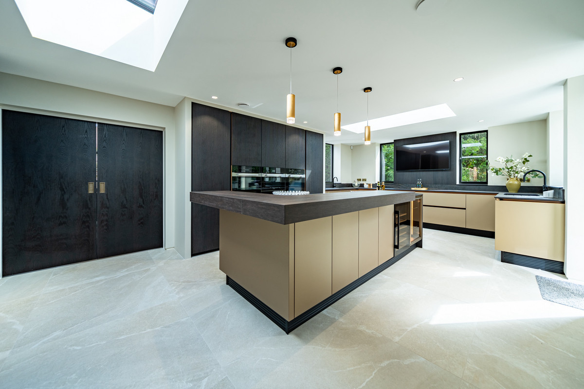 Double pocket doors then lead through to the breathtaking hand engineered German Nolte Küchen’ kitchen, featuring a large central island with bar area, oversized inset induction hob with a built-in downdraft extraction fan and light lantern above. High end appliances include two Miele ovens, microwave and warming drawer, Quooker 5 in 1 tap, and Fisher & Paykel American Fridge Freezer, dishwasher, coffee machine and wine cooler, providing everything you would expect for modern family living.
