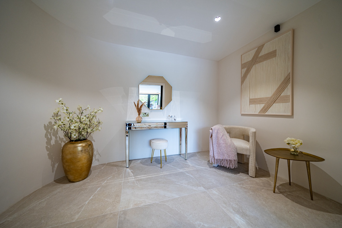 The principal suite features a glazed wall with sliding door access to the garden, flooding the room with light, a large dressing room and a luxurious ensuite. Featuring smart privacy glass, a large Roca smart shower and a freestanding bath, this luxurious ensuite ensures privacy whilst also giving the owners the opportunity to enjoy the views over their private rear garden.