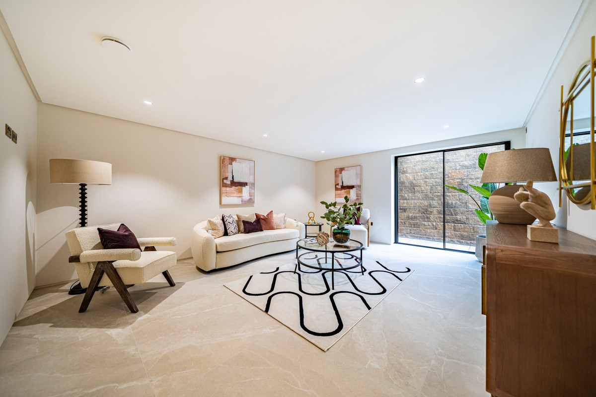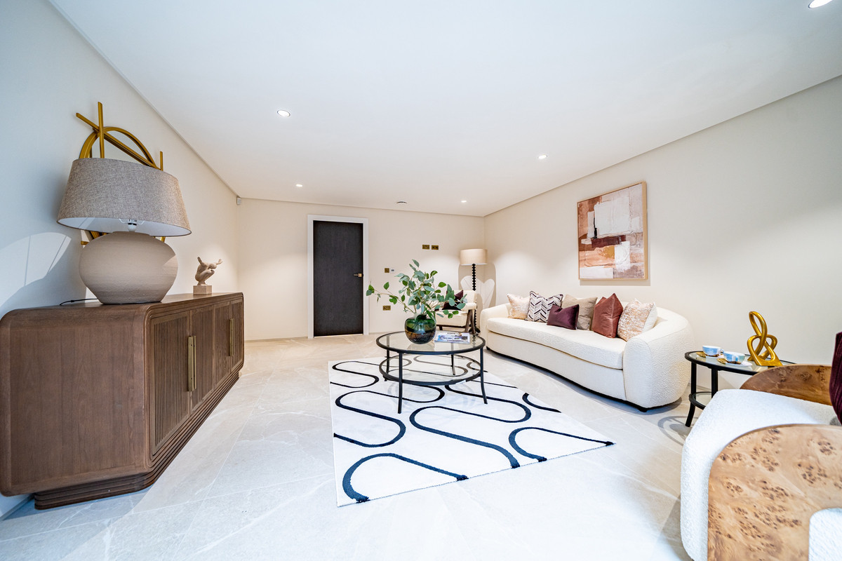 A floating staircase with glass balustrade and automated lighting gives access to the lower ground floor, with beautiful, curved walls housing four good sized double bedrooms all featuring luxurious ensuite shower rooms and a further reception room which could be used as a sixth bedroom if so desired.