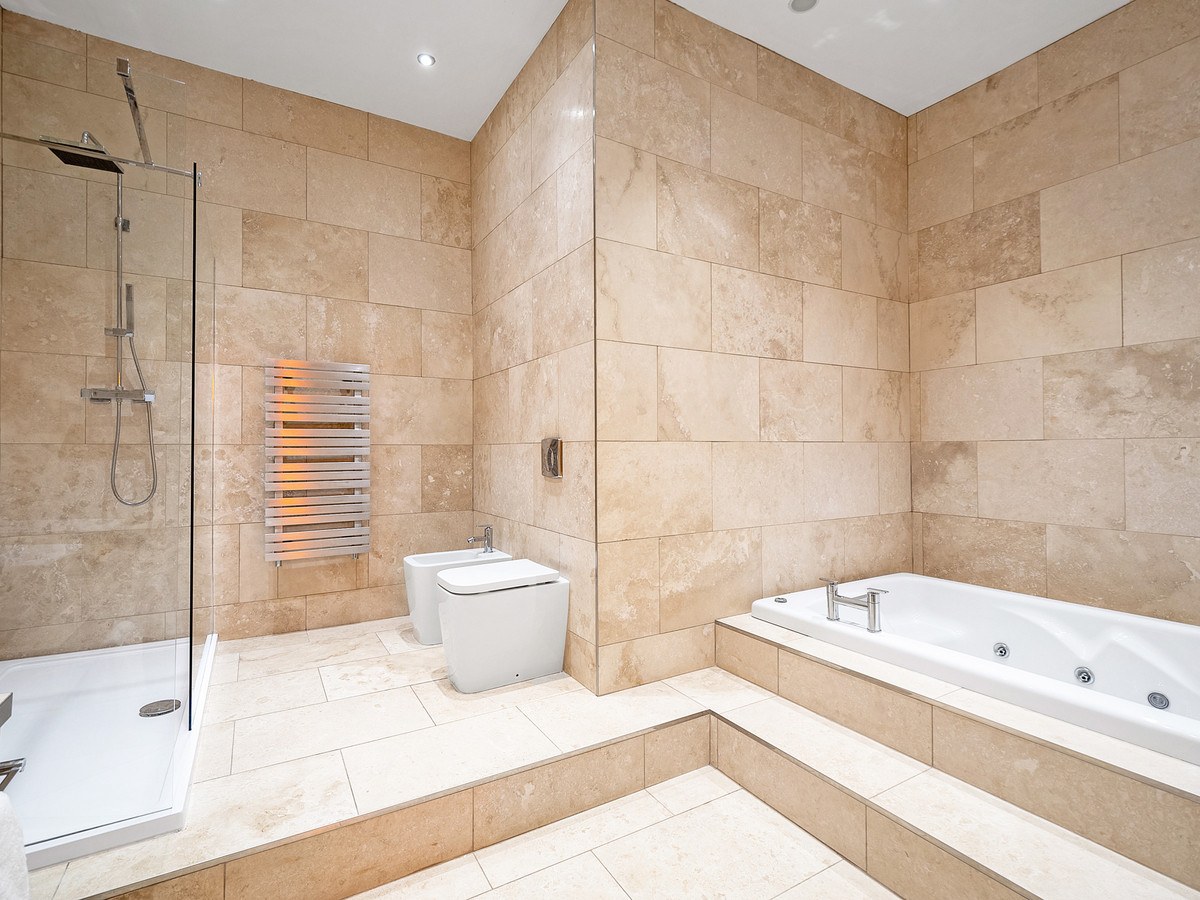 Accessed off the main hallway are three good sized double bedrooms with fitted wardrobes of which one also features a fully tiled ensuite with shower. The other two bedrooms are serviced by a high-end family bathroom with his and hers sinks, a double jacuzzi bath, walk in shower, two brushed stainless-steel radiators, w/c and a bidet.