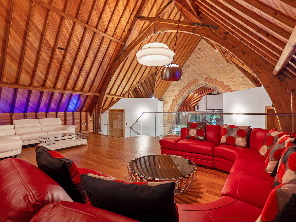 The first floor of the property also benefits from two further double bedrooms, both featuring built in wardrobes and ensuites with showers. The best feature of the entire property has to be the glass walkway with glass flooring looking down over the living room providing access to the mezzanine area which is currently setup as a spectacular cinema room with 8 electric leather reclining chairs and a projector screen that comes down over the stain glassed window making this a very special place to watch tv or movies.