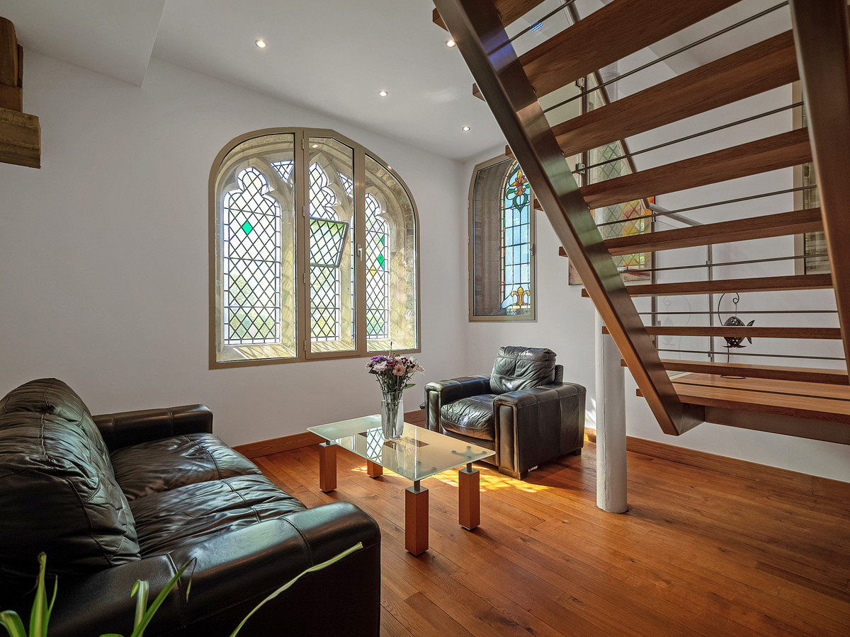 Leading off the entrance hall is the first of the reception rooms. This bright and spacious area offers high ceilings and lots of natural light from the array of beautiful stained-glass windows making this a lovely space to relax and unwind. The feature in this room is the modern floating glass and brushed stainless steel staircase with oak treads leading up to the first floor of the property. The room also features oak wooden floors and underfloor heating which is also found throughout the property. No expense has been spared with the quality of materials used in the restoration of this beautiful church with oak being used for all the skirting, doors and frames throughout the house.