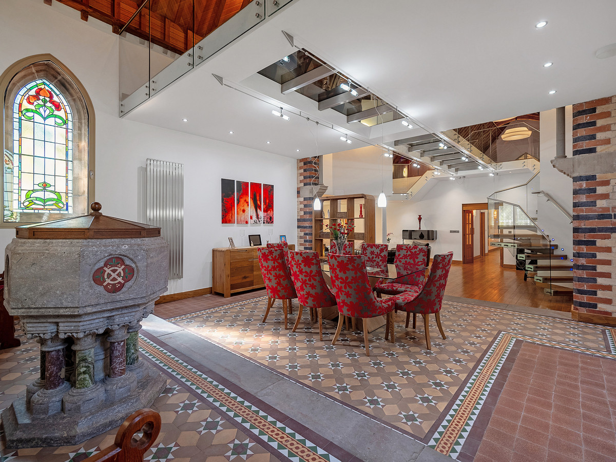 Set on the outskirts of the sought-after village of Mickleover is this imposing five bedroom converted Grade II listed Church. Access is via an electric gate leading to private parking for several vehicles. The property has been lovingly converted to create a fabulous family home measuring over 6,000 sq. ft with open plan areas, a mezzanine cinema room with glass floor bridge, and an impressive recreation space measuring over 47ft in length and 30ft wide.