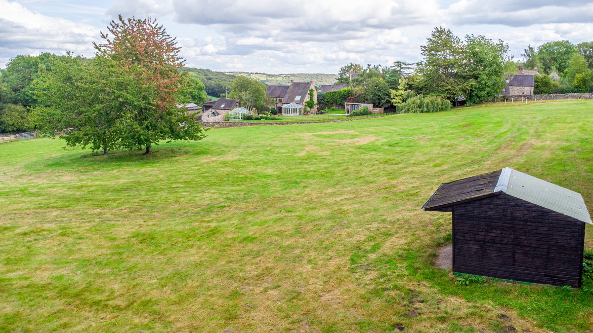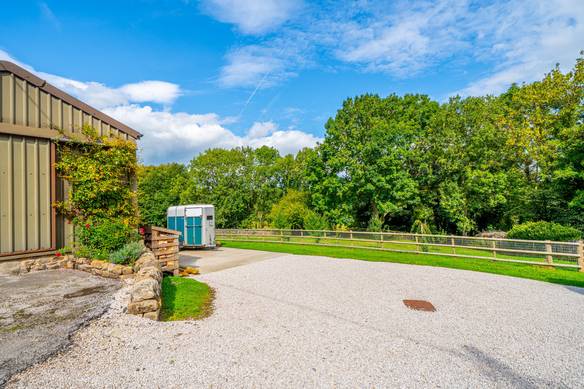 The property is set in secure and well defined grounds measuring circa 7 acres that is split into 3 well-drained fields ideal for equestrian use. The top field has a spring-fed water supply and the lower fields have mains-fed troughs. Located on the land is a large American barn with four bay stables within, an orchard, an enclosed area for chickens to roam around freely and a fenced vegetable garden.