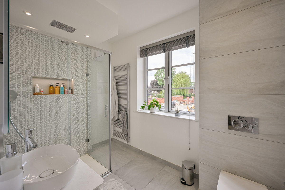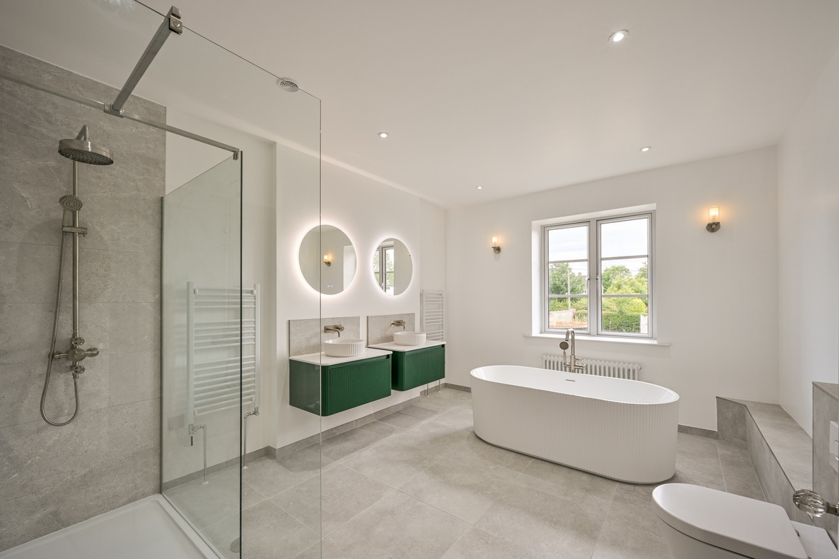 The stylish family bathroom presents a modern five-piece suite, comprising a fluted freestanding bath with a mixer tap and handheld shower, a concealed cistern WC, twin countertop wash basins mounted on contrasting wall-hung vanity units, a spacious walk-in double shower and two warming heated towel rails.