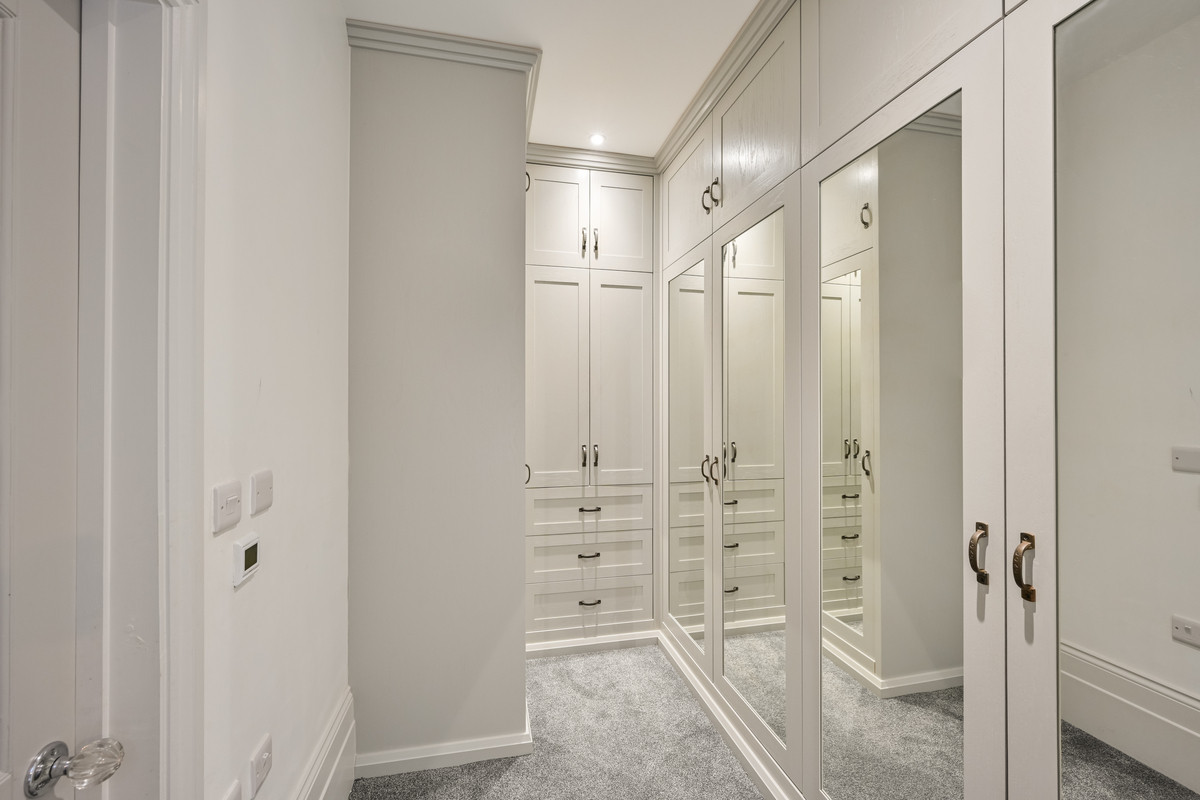 The principal bedroom is a welcoming retreat, complete with its own balcony displaying stunning views over the countryside beyond and a sizable walk-through dressing room, fitted with an array of wardrobes and drawers to either side, leading to a generous en suite bathroom. The en suite holds a freestanding bath, a substantial twin sink vanity unit, a discreet low flush WC, and a fully tiled double shower equipped with both a rainfall showerhead and a handheld attachment.