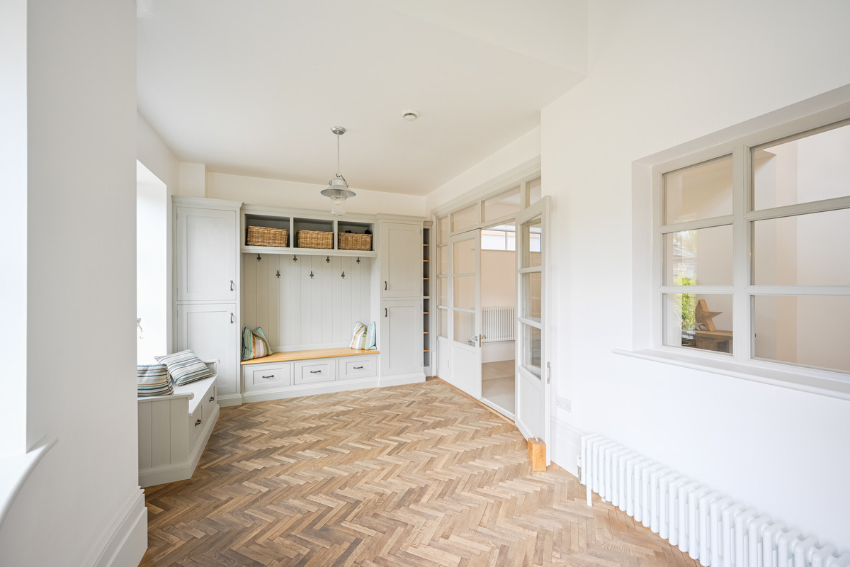The entrance hall opens into a generous and welcoming space, laid with herringbone parquet flooring, a feature curved exterior wall and bespoke oak cabinetry, providing practical and stylish shoe & coat storage. Glazed double doors offer a transition into the impressive entrance hall, a vast, bright space, laid with large format tiles, displaying a sweeping curved staircase ascending to the central hallway on the upper level.