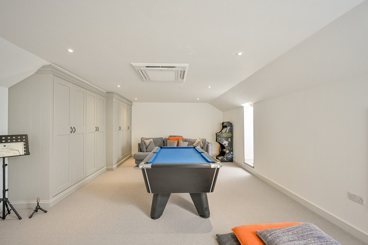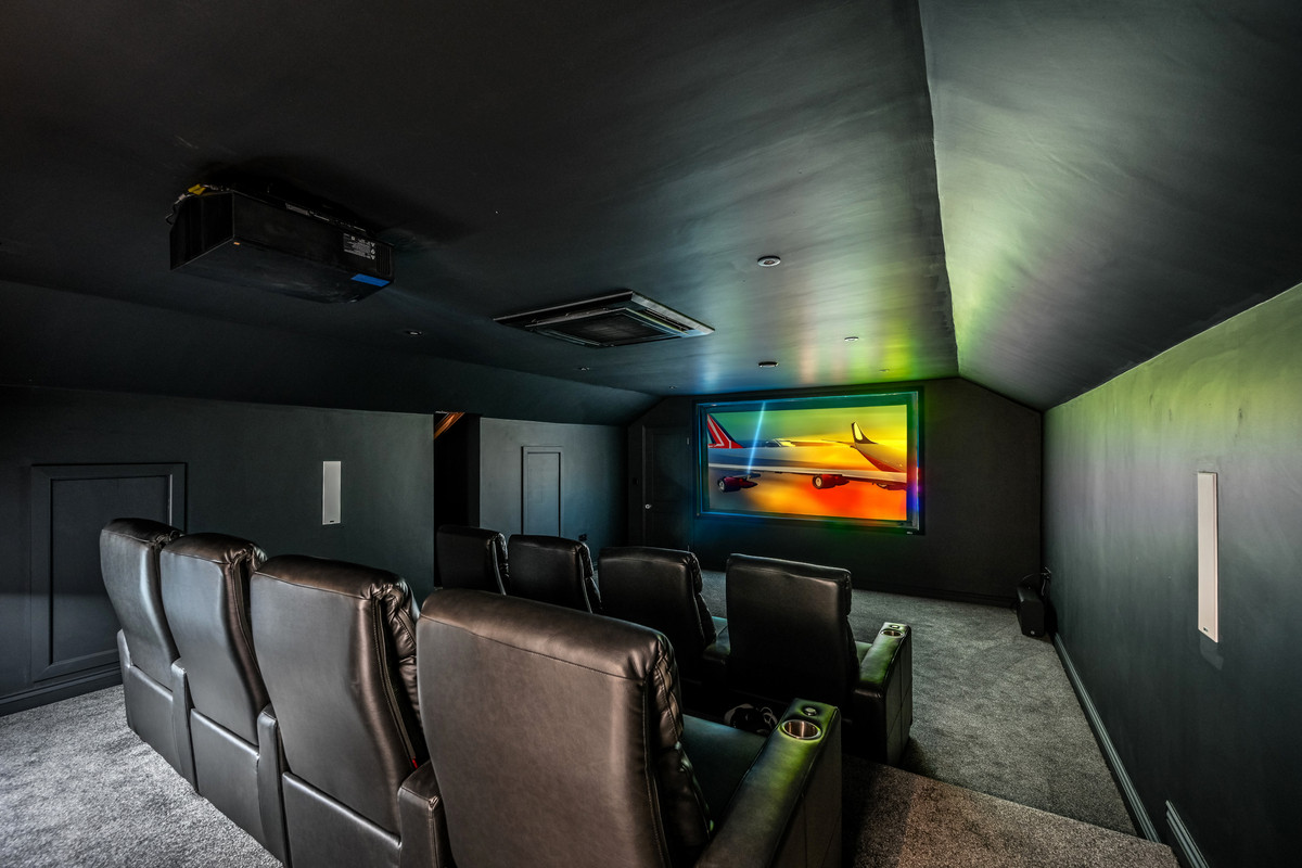 A staircase leads to the second-floor games room, which incorporates built-in storage solutions and houses approximately half of the property's hot water cylinder system. There are Velux windows, air conditioning, and convenient access to the eaves at this level. Adjoining the games room is a dedicated home cinema room, complete with eight reclining seats, Kef surround sound system, a large 120-inch screen and projector, alongside a built-in bar area with storage below. From the cinema room, a door leads to a second-floor WC and a substantial storage room, which subsequently provides access to a dedicated plant room.
