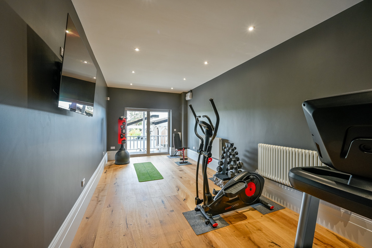 Completing this level are a conveniently located guest WC, a dedicated study to the front of the property and a private home gym with bi-folding doors out onto the decking area.