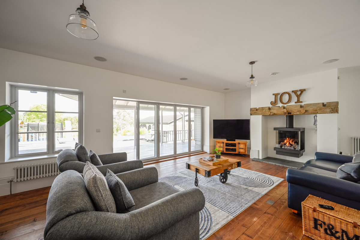 Situated to the rear of the property, the spacious, principal sitting room enjoys far stretching views over the garden and beyond, with bi-fold doors creating a seamless connection to the surrounding wrap-around deck. Inside, a hanging, log burner style gas fire with a rustic wooden mantel exudes warmth, serving as the focal point of the room. The sitting room is laid with wide wood strip flooring and is accessible via both the hallway and through a wide opening from the kitchen diner.