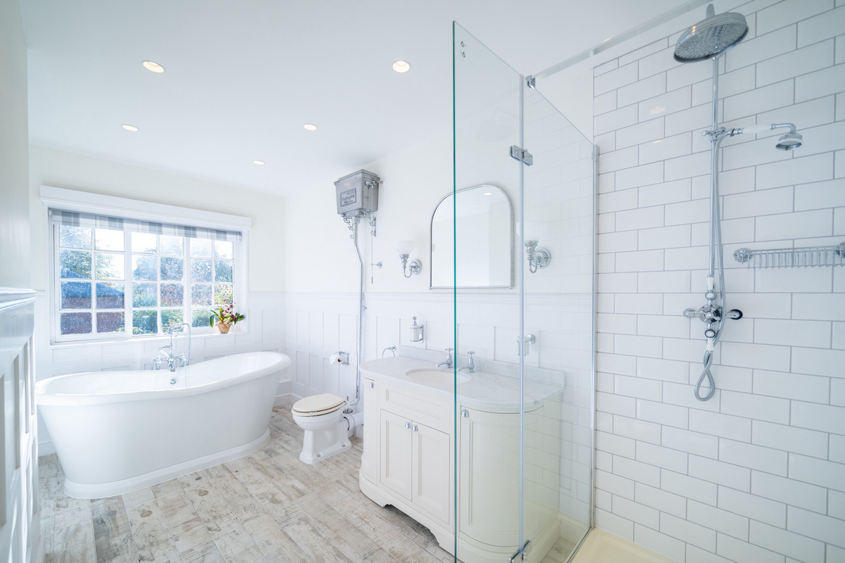 The main family bathroom within the home is spectacular, featuring a Victorian-style roll-top bath, oversized walk-in shower, and contemporary fittings, all of which create a truly luxurious and tranquil space.