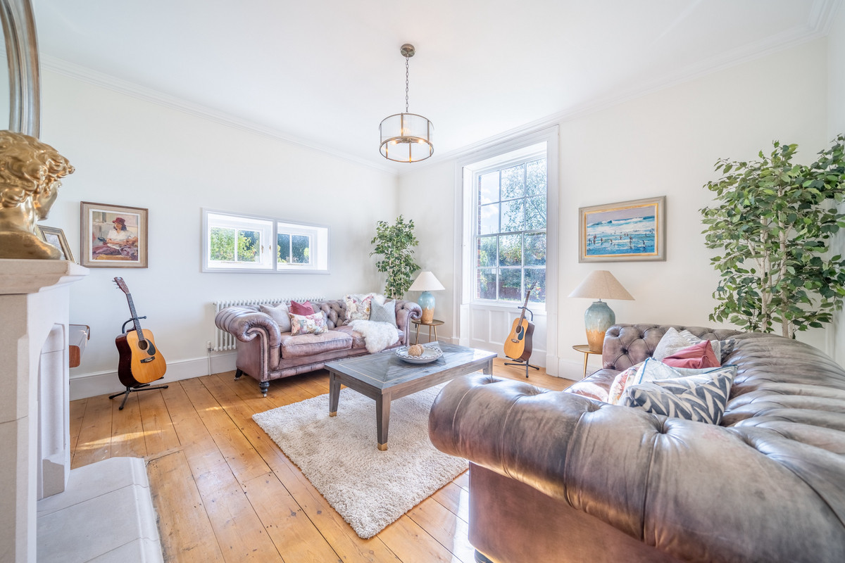 The front of the property faces to the west and showcases a semi-circular off-centre doorway with raised moulded impost blocks and double-glazed panelled front doors. This grand entrance opens into a spectacular hallway which boasts an original Minton floor, spacious enough to accommodate occasional furniture, whether it be a piano or occasional seating in front of the hallway fire. The hallway features a beautiful, prominent ceiling arch and a curved balustrade staircase. The imposing hallway gives access to all the downstairs accommodation, the first being two versatile south-facing reception rooms.