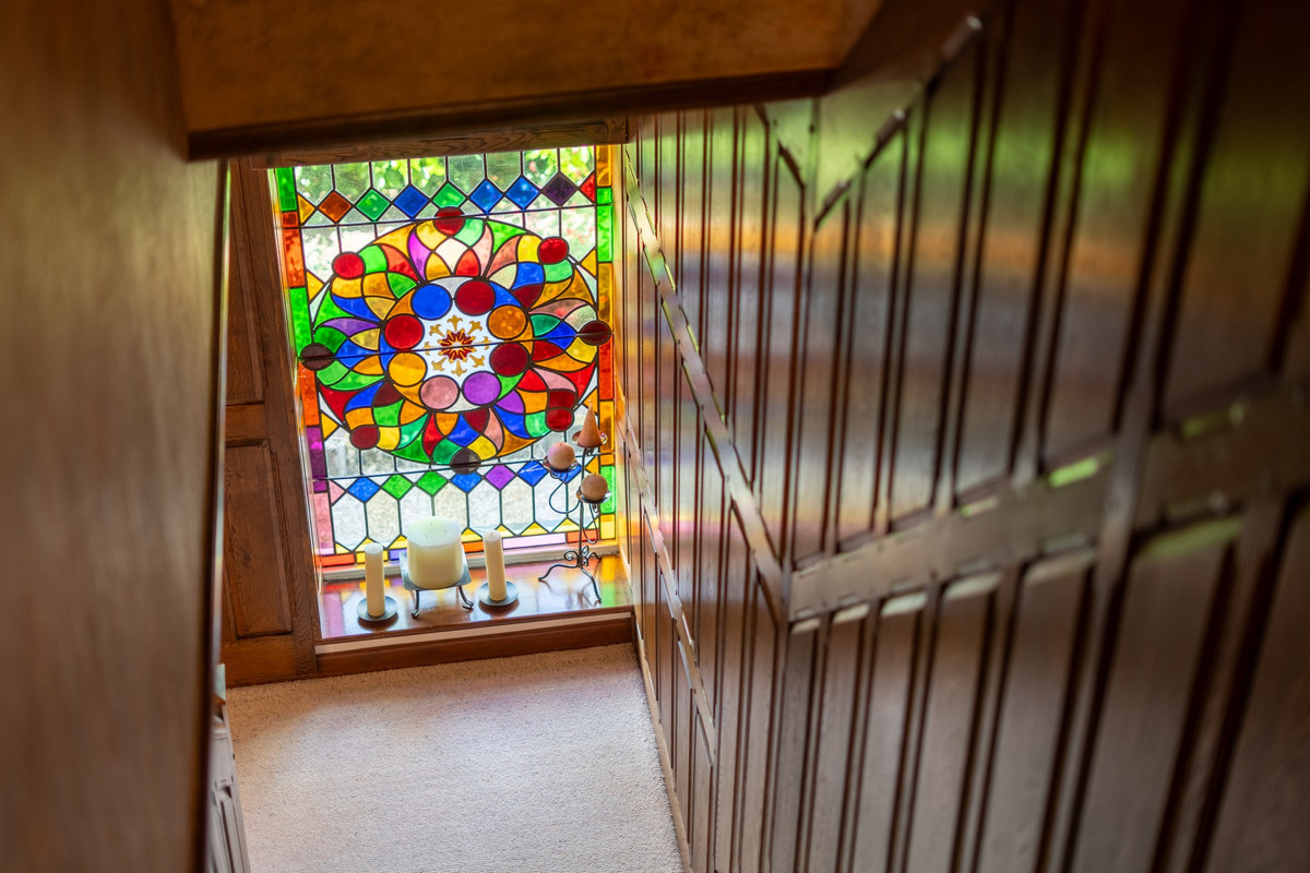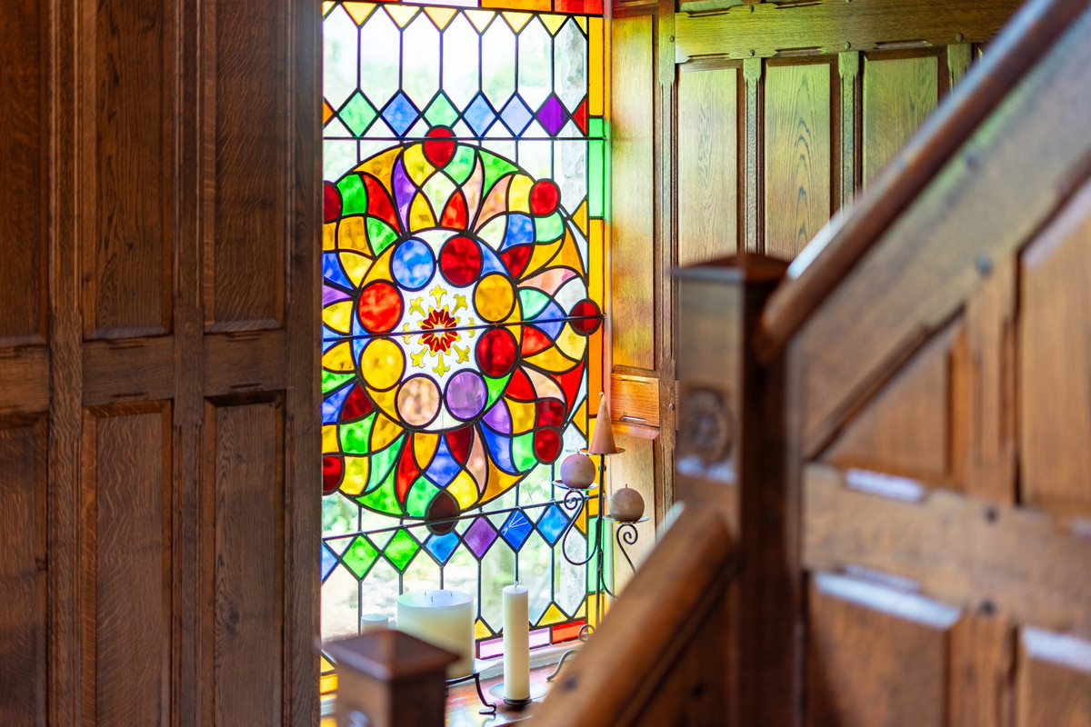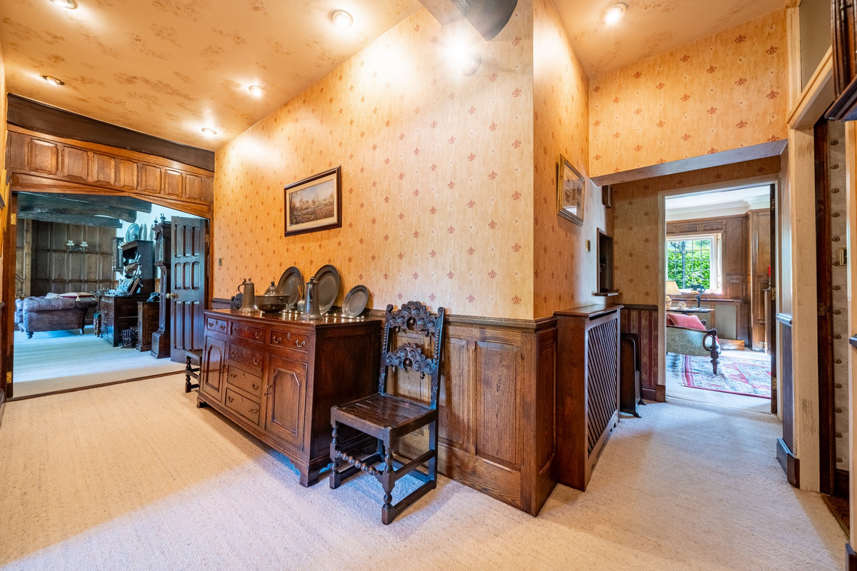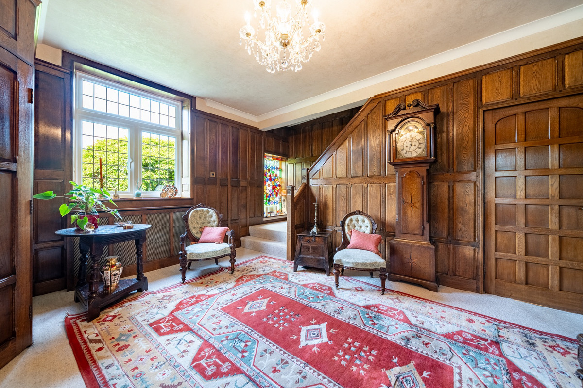 Upon entering, you’re greeted by a grand oak-panelled reception hall, immediately setting the tone for the rest of the home. A striking stained-glass window casts a kaleidoscope of colour across the space, creating a memorable first impression. This central hall provides access to all principal reception rooms, each spacious and beautifully appointed.