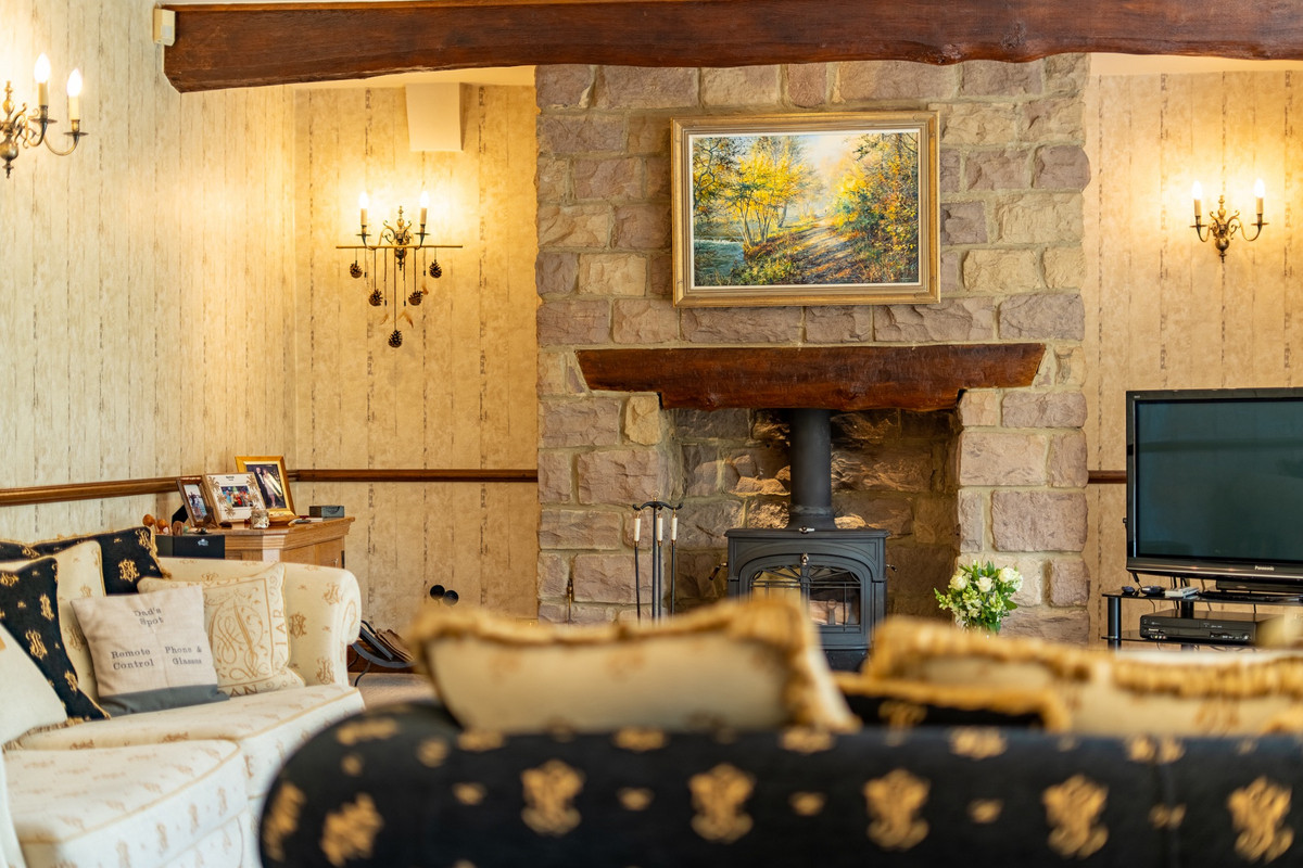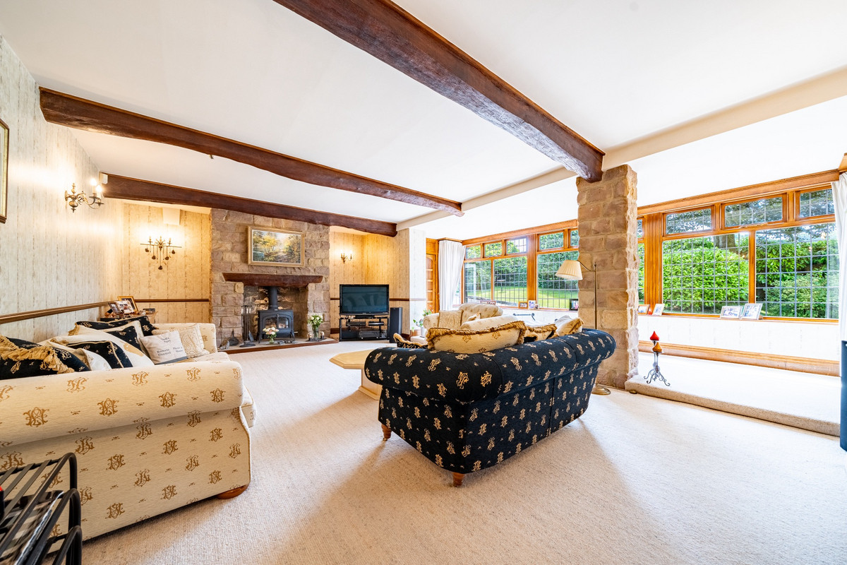 The formal sitting room is a standout, generously proportioned with high ceilings, a full-height Derbyshire stone fireplace, and a distinctive top-loading log-burning stove. A broad bank of front-facing windows floods the room with natural light and offers views over the private driveway. It’s a space that seamlessly blends comfort with sophistication, ideal for relaxed evenings or hosting guests. Adjacent to this, the games room provides a more informal retreat, perfect for leisure or adaptable to suit individual lifestyle needs.