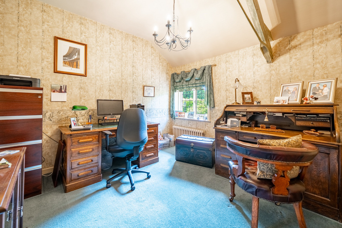 One of the bedrooms is currently used as a study, offering flexibility for remote working or creative pursuits. A spacious linen cupboard with a circular feature window adds a delightful architectural touch and further practical storage.