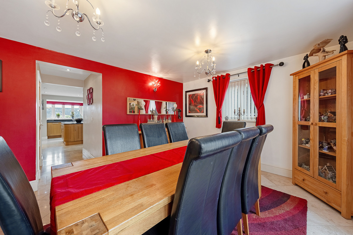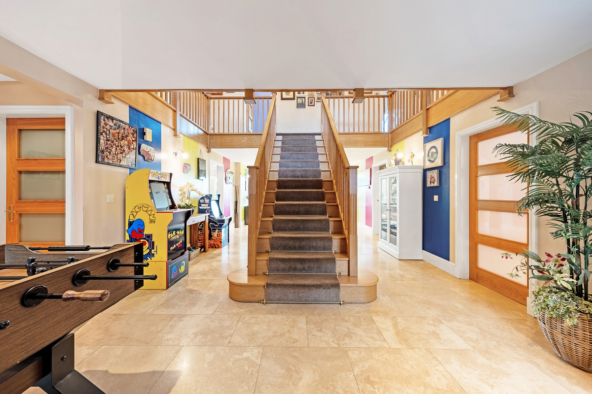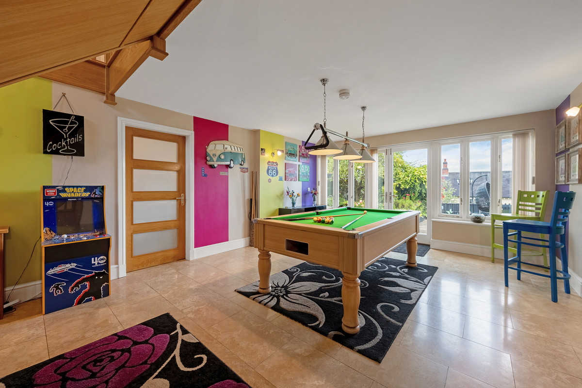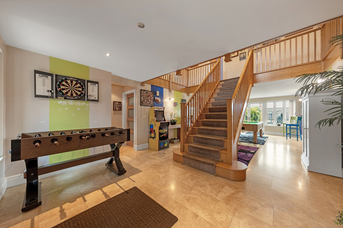 The front door opens into an impressive, tiled entrance/reception hall with solid oak floating staircase rising to the first floor. The heart of this magnificent home is the open plan entertaining space with games area and patio doors leading out onto the garden patio. The family kitchen with centre island is located off the entertaining area and features tiled flooring, a double sink overlooking the garden, quartz countertops and integrated appliances including dishwasher, double oven, microwave and induction hob. Located off the kitchen is a good size utility room with chrome sink, space for both a washing machine and tumble dryer plus access to the side of the property.