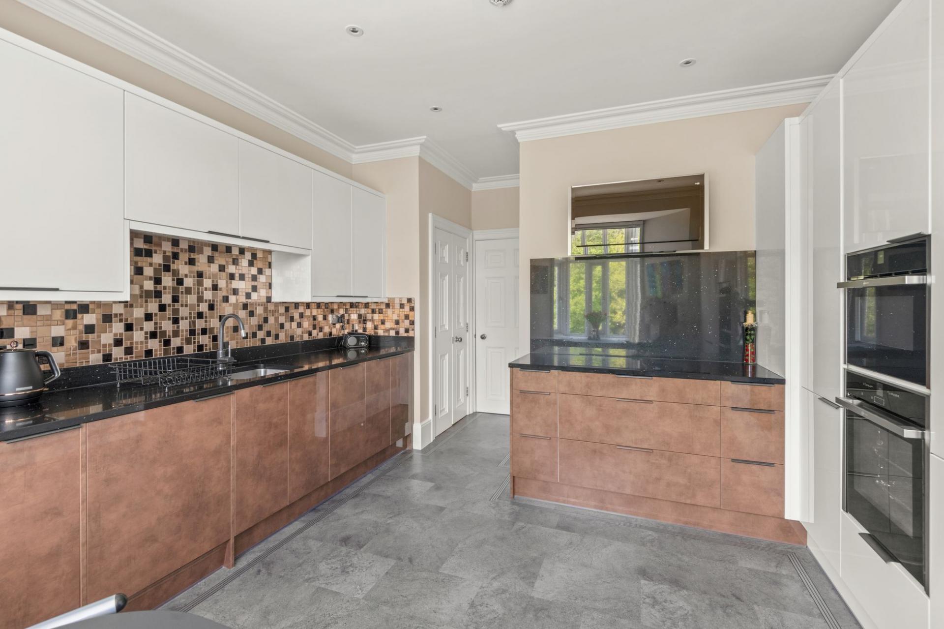 A true highlight of the apartment is the contemporary Wren kitchen — sleek and sophisticated, with Karndean flooring and contrasting coloured gloss units, integrated Neff appliances, a full-length fridge and full-length freezer, dual washer/dryers, and elegant quartz worktops. A window frames a picturesque view across the grounds, adding a daily reminder of the idyllic setting.