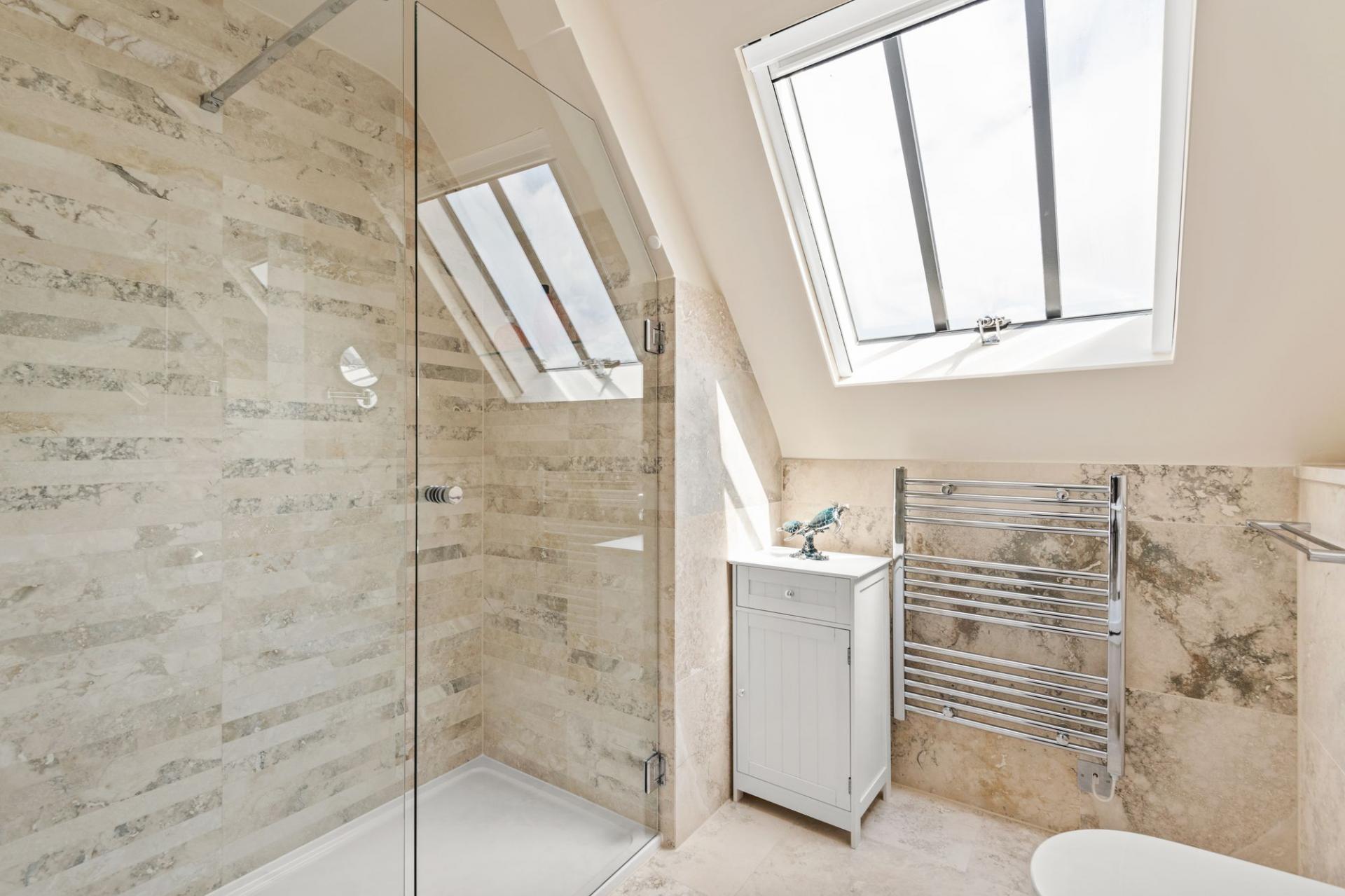 The entrance hall sets the tone with a sense of light and practicality, offering bespoke built-in storage and a conveniently placed cloakroom. Underfloor heating spans the first floor for year-round comfort, while traditional radiators warm the upper level, combining efficiency with classic style.