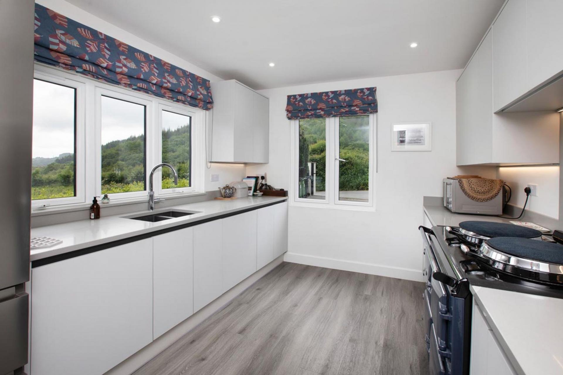 The kitchen was newly fitted in 2023 and strikes a beautiful balance between modern convenience and rustic charm. Sleek quartz worktops, cabinetry in light tones, and sweeping countryside views create an uplifting space to cook and gather. An electric AGA nods to the rural heritage of the home, complemented by a larder cupboard and a side entrance with additional storage—perfect for daily practicality.