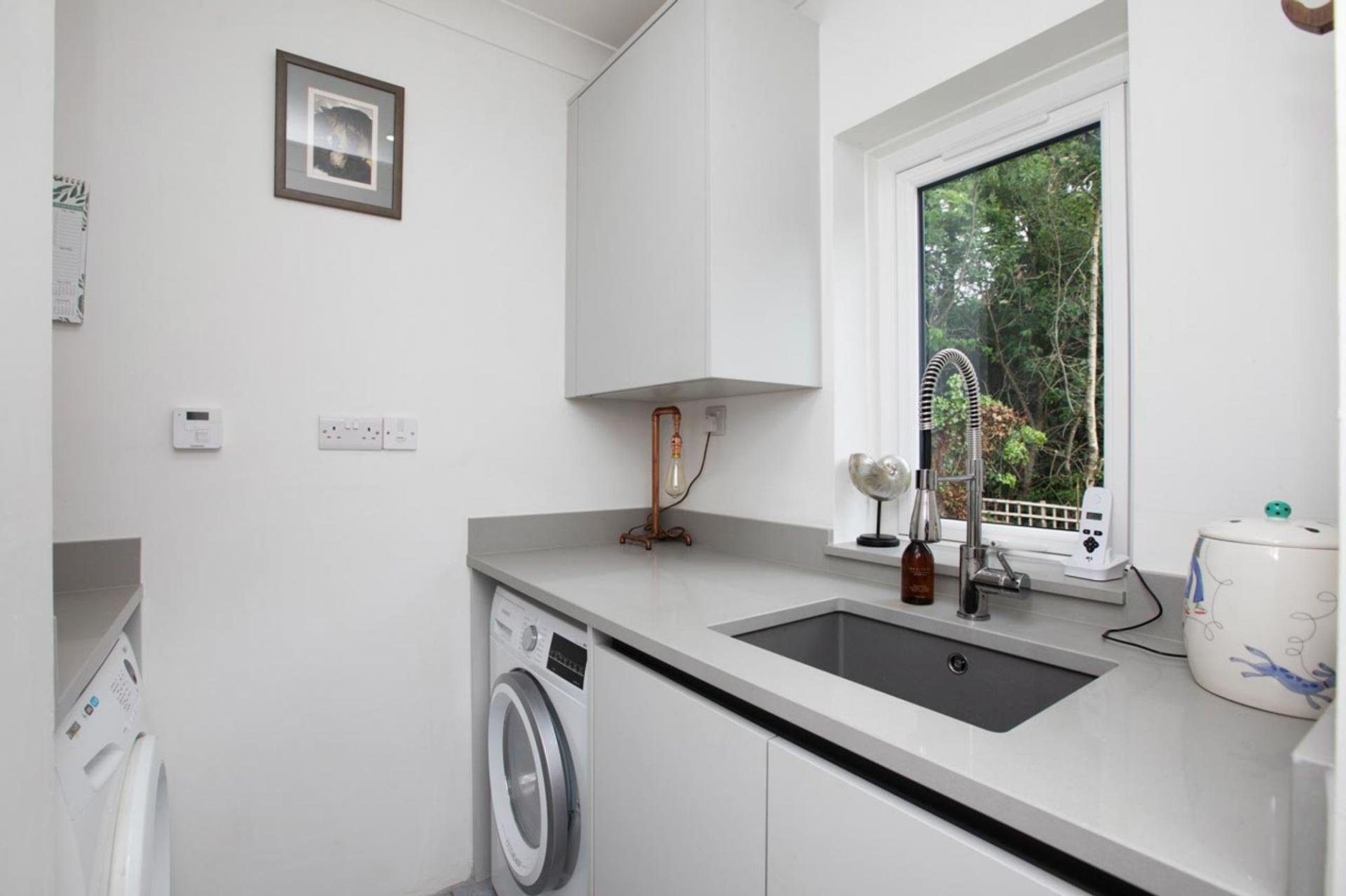 Completing the ground floor is a smartly designed utility room, fitted with cabinetry and worktops to match the kitchen, and offering plumbing for laundry appliances. A secondary entrance nearby adds further functionality to this flexible home.