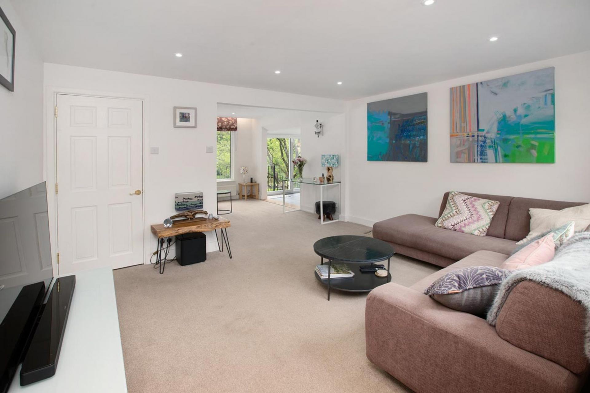 The main living room stretches the full depth of the property, flooded with natural light from a stunning picture window that frames views of the garden and the countryside beyond. This generous space offers flexibility in layout and an inviting atmosphere for both quiet evenings and entertaining.