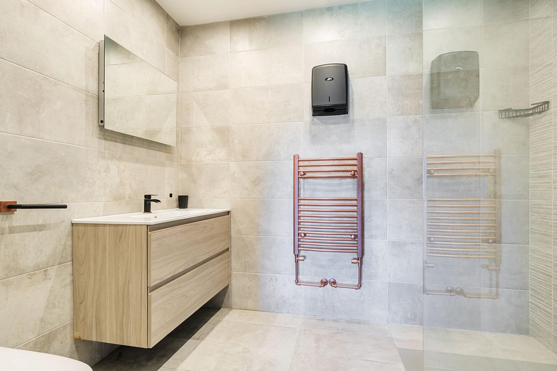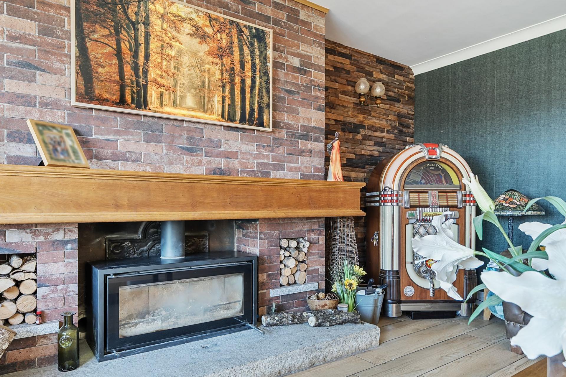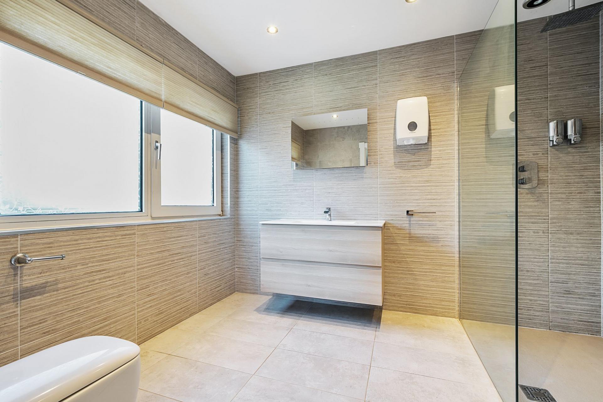 The living room, accessed from the dining area, is a true statement space, where your gaze is drawn to the impressive wooden-framed fireplace. The exquisite wood-effect porcelain tiled flooring further enhances the sense of sophistication. Sliding doors from the living room lead seamlessly to the sun terrace, ideal for alfresco dining or relaxing in the open air.