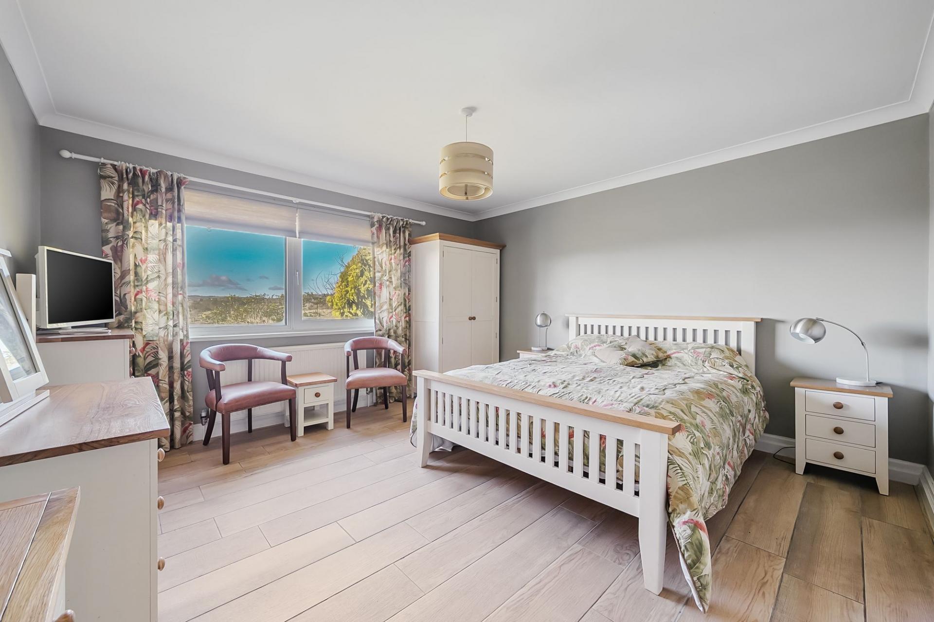 Upon arrival, you are greeted by a spacious, light-filled hallway that sets the tone for the rest of the property. To the east wing, three generously proportioned double bedrooms await, each featuring refurbished, luxurious en-suite shower rooms that echo the standard of a five-star hotel. Two of these bedrooms offer stunning vistas over the meticulously landscaped garden and the picturesque countryside beyond.