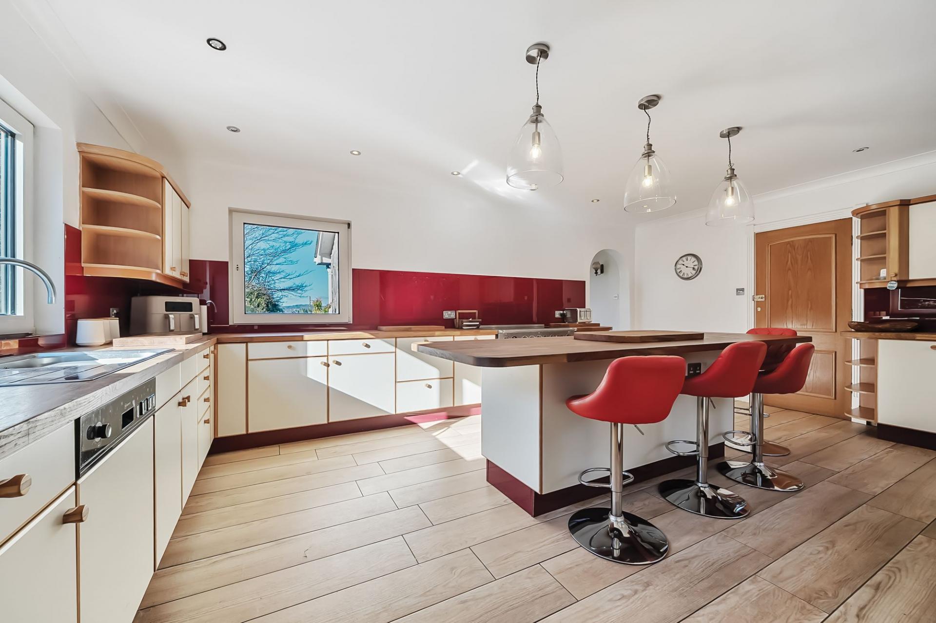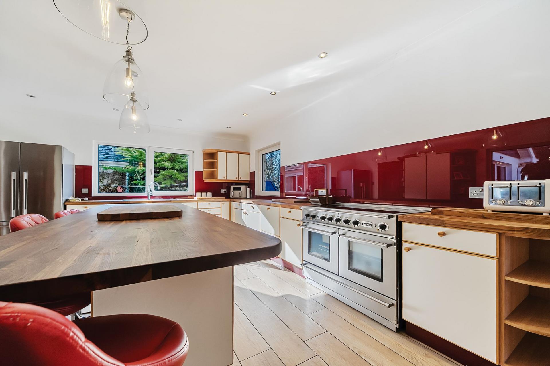 Off the hallway, you’ll find a quiet study, thoughtfully positioned away from the main living areas to ensure a tranquil work environment. Continuing along, the kitchen/breakfast room offers a vast, open space designed with both cooking and socialising in mind. A central island serves as both a hub for preparation and a focal point, providing ample worktop space and storage. The kitchen is equipped with a premium Falcon oven with a five-ring hob, an integrated dishwasher, and space for a large fridge/freezer, ensuring it’s perfect for family meals or entertaining. The adjacent dining room offers generous space for a large table, with views of the garden, creating an inviting setting for formal or informal dining.